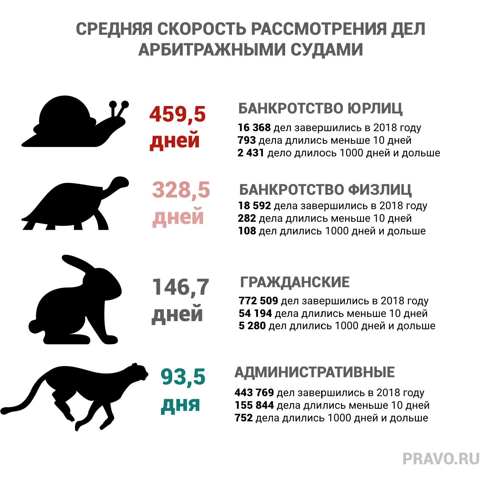 Традиционно самыми затяжными становятся дела о банкротстве юридических лиц. Среди дел, рассмотрение которых было закончено в 2018 году, почти 15% дел о банкротстве юрлиц длились более 1000 дней, то есть 2,5 года и дольше. Сравнительно новое для арбитражных судов банкротство физических лиц в среднем занимает около 382 дней, то есть больше года.