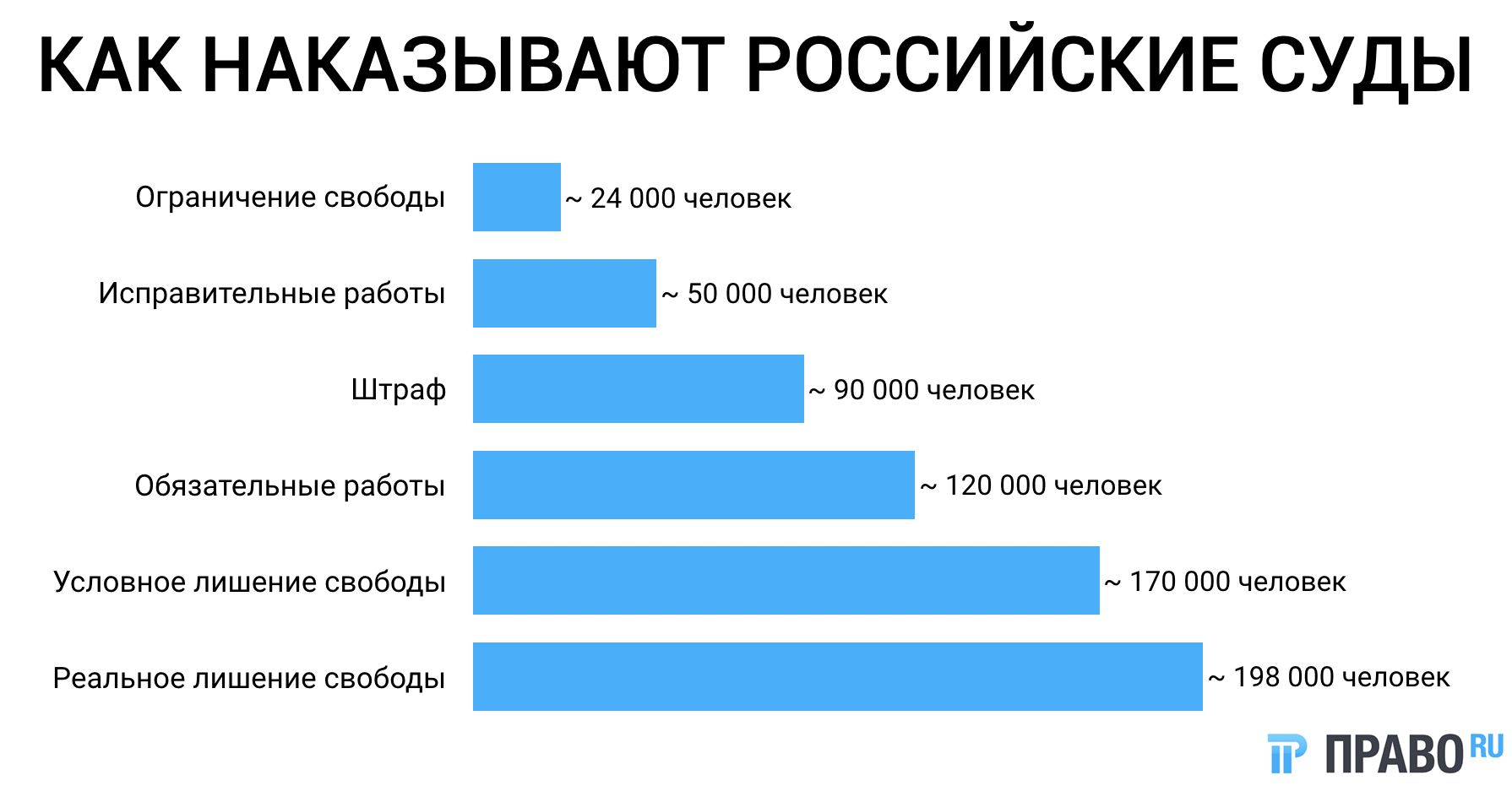 Несмотря на это, суды выбирают наказание в виде лишения свободы практически по каждому третьему обвинительному приговору, а по каждому четвертому суды назначают условное лишение свободы. Реже всего суды выбирают такое наказание, как «ограничение свободы», – всего для 24 000 человек.