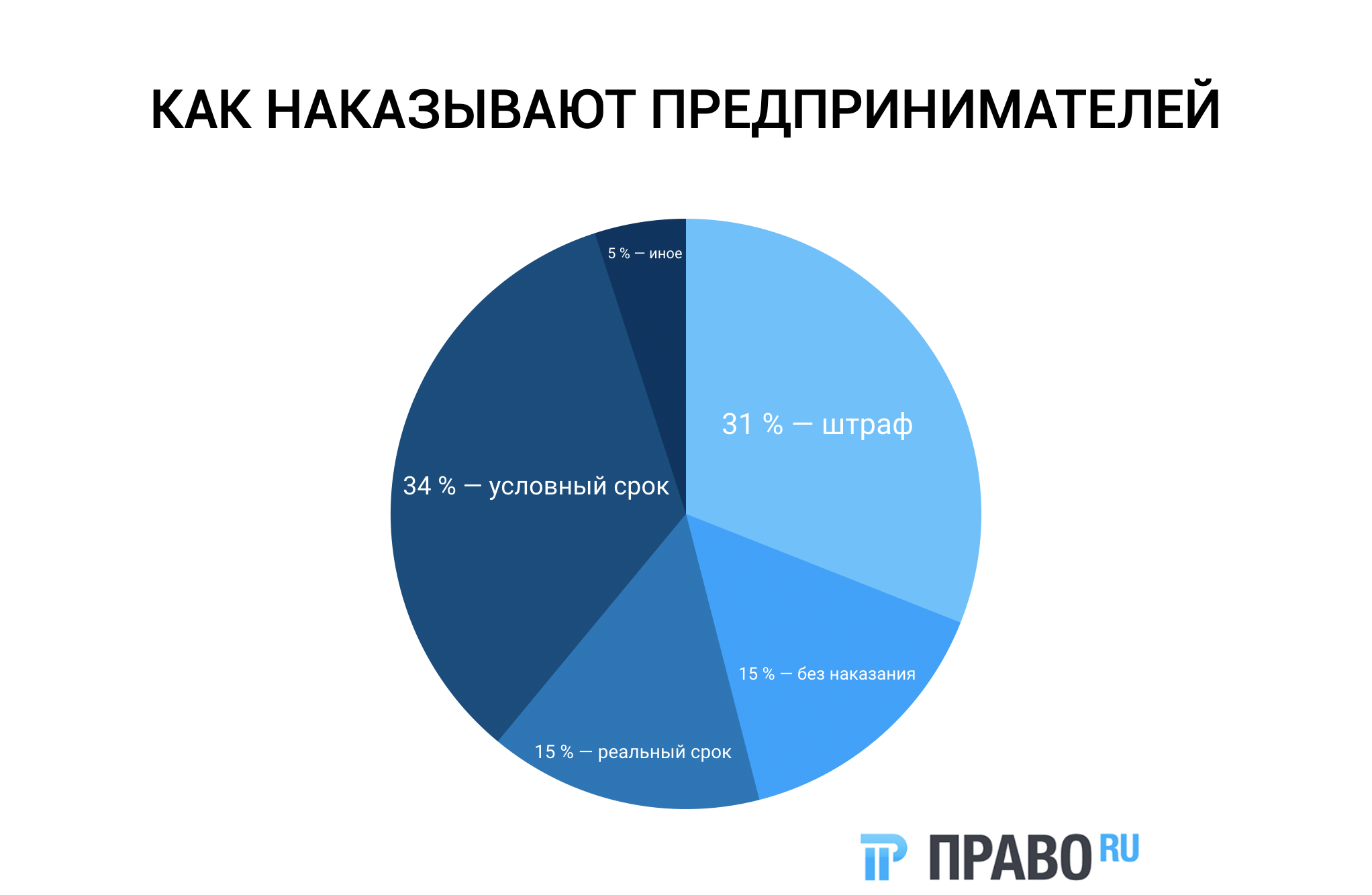 Суды лишают бизнесменов свободы в 15% случаев, а чаще всего назначают для них условный срок (34% от всех приговоров). Часто – в 31% случаев – используется судебный штраф.