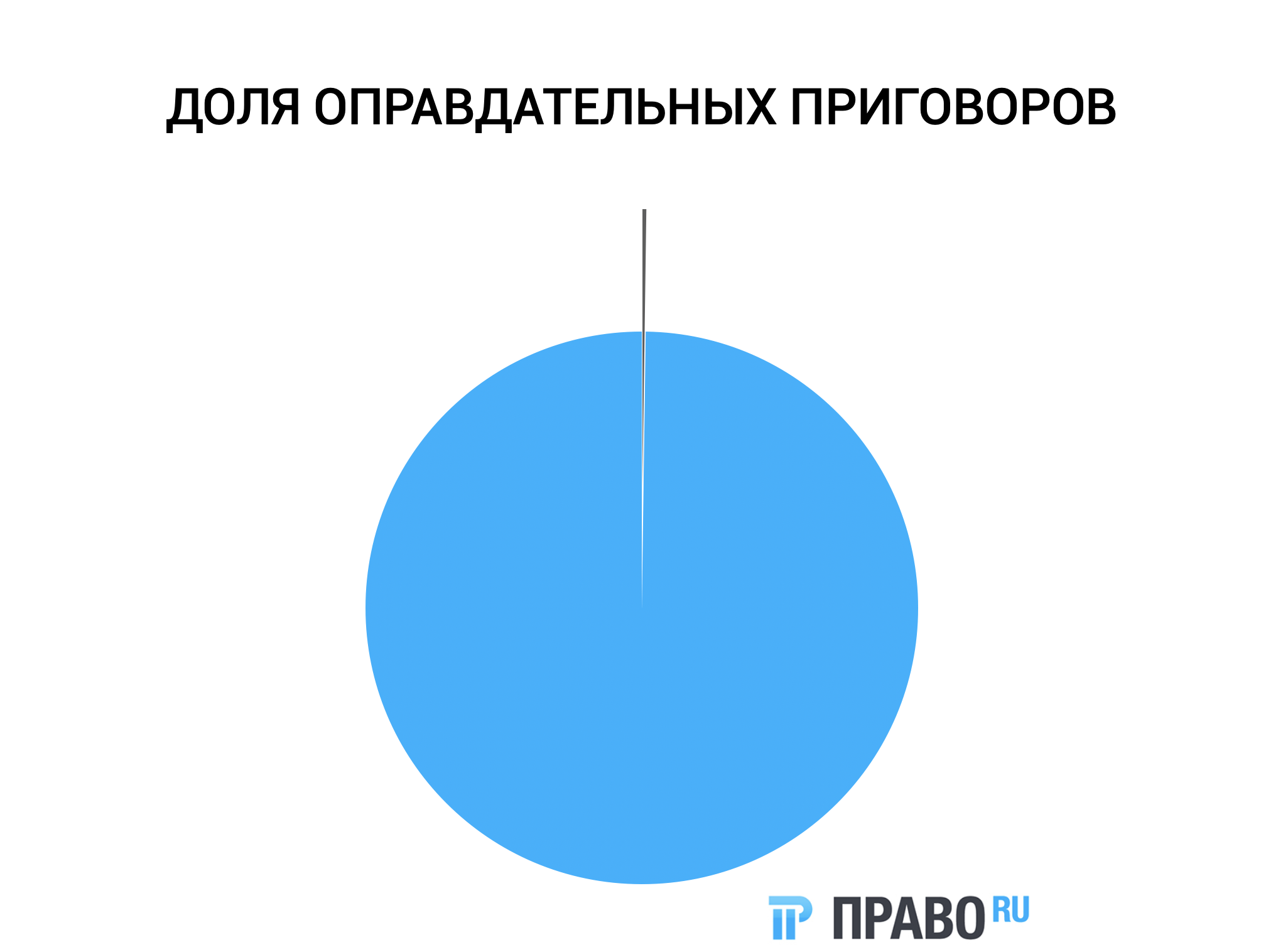 В 2018 году российские суды рассмотрели уголовные дела в отношении почти 900 000 человек. Из них осудили 685 000 человек, то есть три четверти от общего числа, а оправдали всего 2000. Так что доля оправдательных приговоров в общем числе незначительно выросла и составила приблизительно 0,3%. Это больше, чем в 2017 году, – тогда показатель составил 0,2%.
