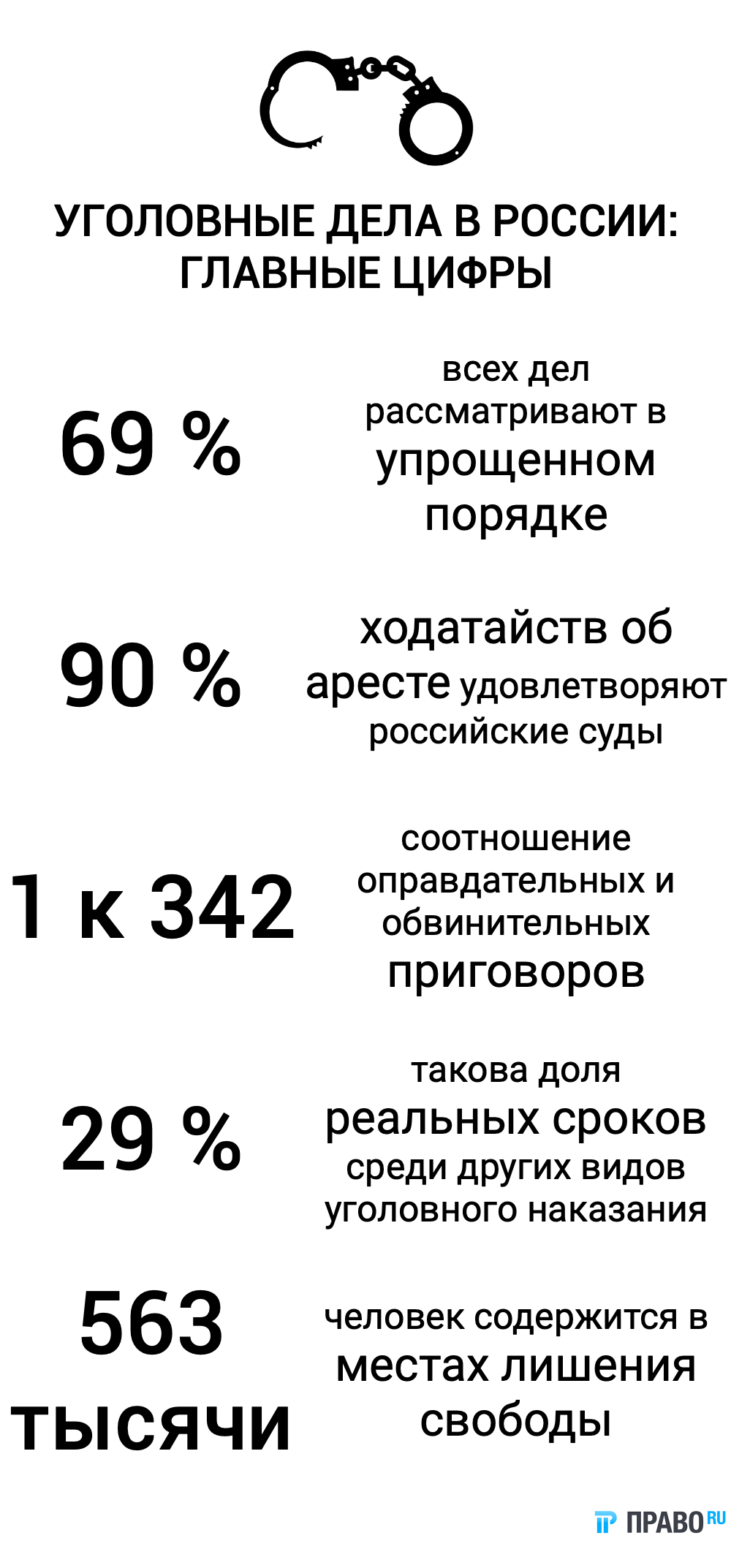 Суды рассмотрели 69% процентов всех уголовных дел в особом порядке – он применяется, когда обвиняемый согласен с предъявленным ему обвинением. «Высокий процент рассмотрения дел в особом порядке связан с желанием самих обвиняемых, поскольку наказание не может превышать 2/3 максимально допустимого», – напоминает Антон Гусев, руководитель практики уголовно-правовой защиты бизнеса Bryan Cave Leighton Paisner (Russia) LLP.