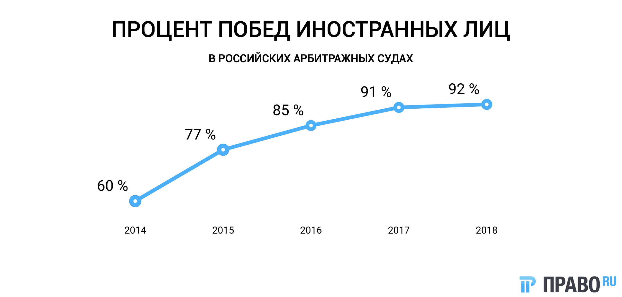 При этом иностранные компании не только начали чаще участвовать в экономических спорах в России, но и стали больше таких споров выигрывать.