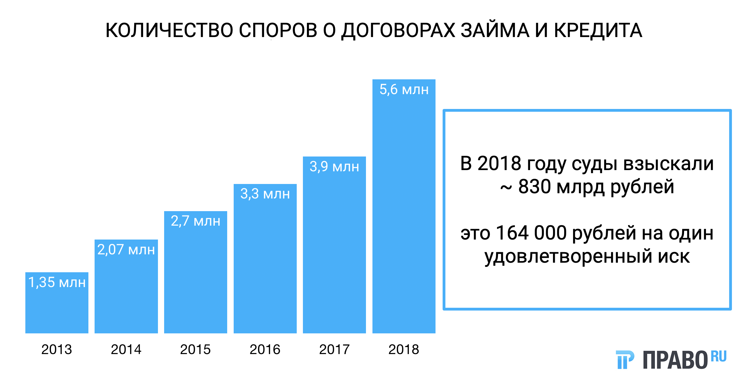 Продолжает расти и количество дел о взыскании по договорам займа и кредитным договорам: если в 2013 году суды рассмотрели 1,359 млн таких дел, то в 2018 году это число выросло более чем в четыре раза и составило 5,6 млн. Общая же сумма требований, которую удовлетворили суды по таким делам, составила почти 830 млрд руб. – в среднем 164 000 руб. на один иск.