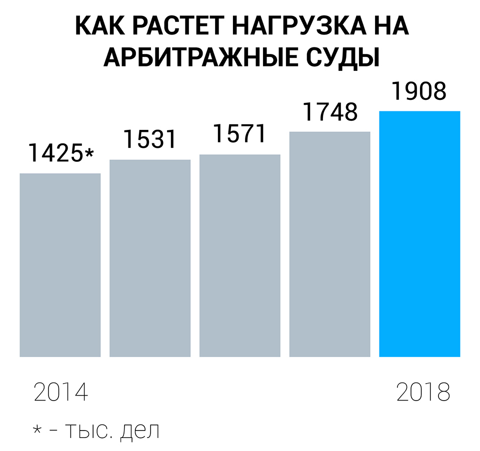 Пропорционально растет и количество рассмотренных судами дел – по этому показателю рост составил 160 000 дел, или 9,1%, – до 1,908 млн.