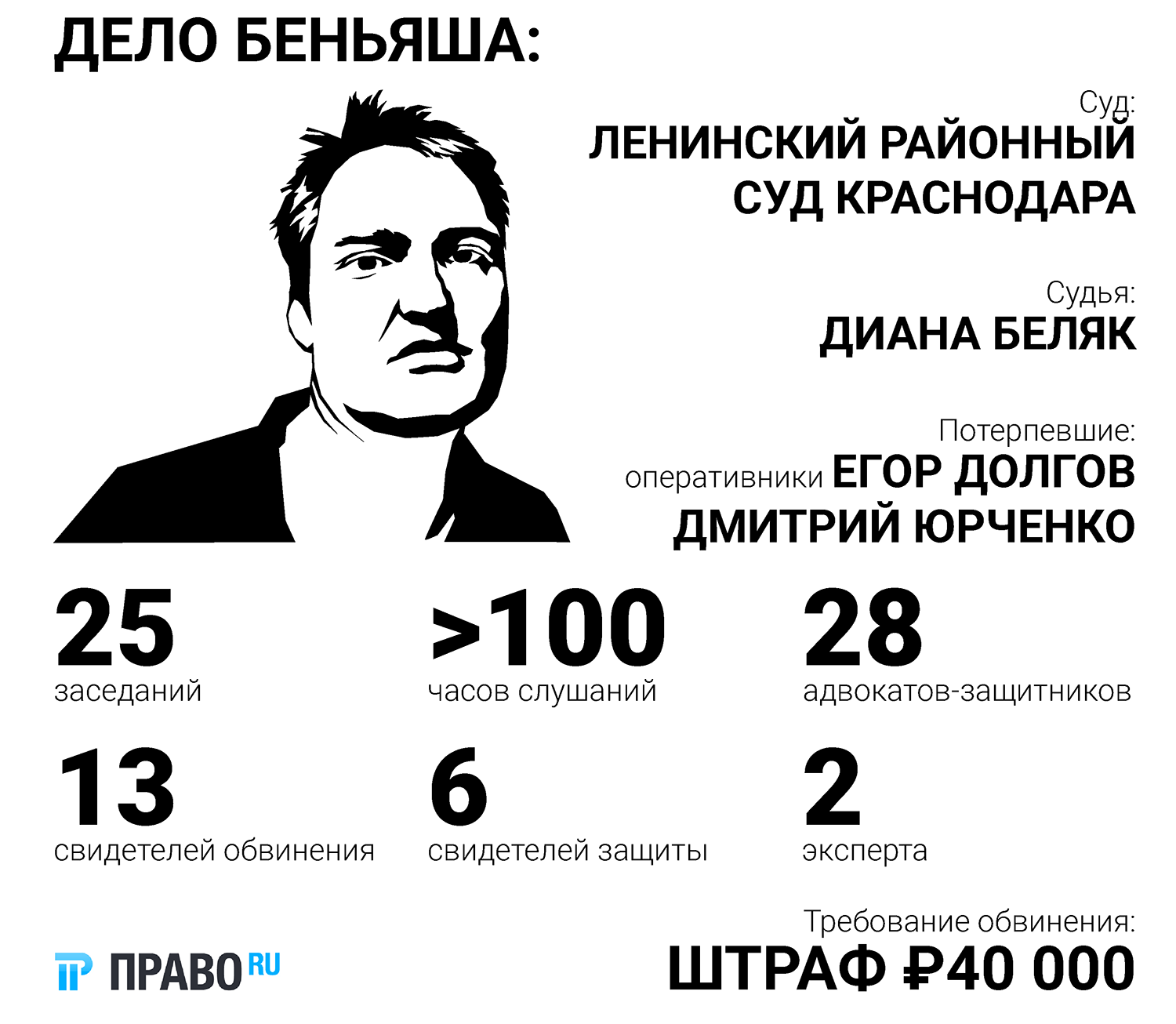 Краснодарского адвоката Михаила Беньяша обвинили в нападении на полицейских. По версии следствия, защитник в полицейской машине несколько раз ударил одного оперативника, а второго укусил за руку. Сам обвиняемый с самого начала всё отрицал. История вызвала большой резонанс в прессе и юридическом сообществе: в защиту коллеги выступили сотни адвокатов по всей стране и даже иностранные защитники. 11 октября 2019 года Беньяша признали виновным и оштрафовали на 30 000 руб.