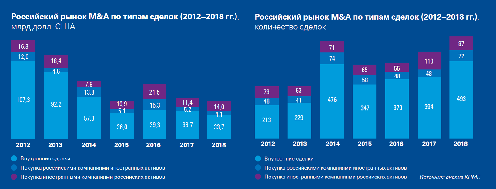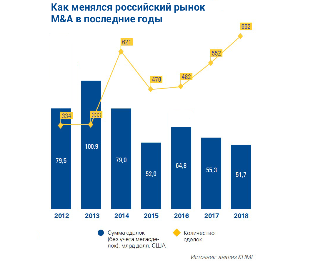 В 2018 году количество сделок на российском рынке слияний и поглощений значительно выросло: с 552 в 2017-м до 652 в прошлом году, следует из исследования КПМГ. Самый существенный рост продемонстрировал IT-сектор, где число сделок увеличилось в три раза по сравнению с предыдущим периодом. Вместе с тем по стоимости суммы такие соглашения снизились на 7%. Рост этих цен, по сравнению с 2017 годом, зафиксирован только в двух ключевых секторах экономики: нефтегазовом (на 96,8%) и потребительском (на 55,6%). А основной тенденцией на рынке стала консолидация активов. Об этом свидетельствует ряд масштабных сделок по выкупу компаниями собственных акций. Три из них даже вошли в топ-10 самых крупных за прошлый год. Так, значительные пакеты собственных ценных бумаг у миноритариев купили «Роснефть», «Мегафон» и «Лукойл».