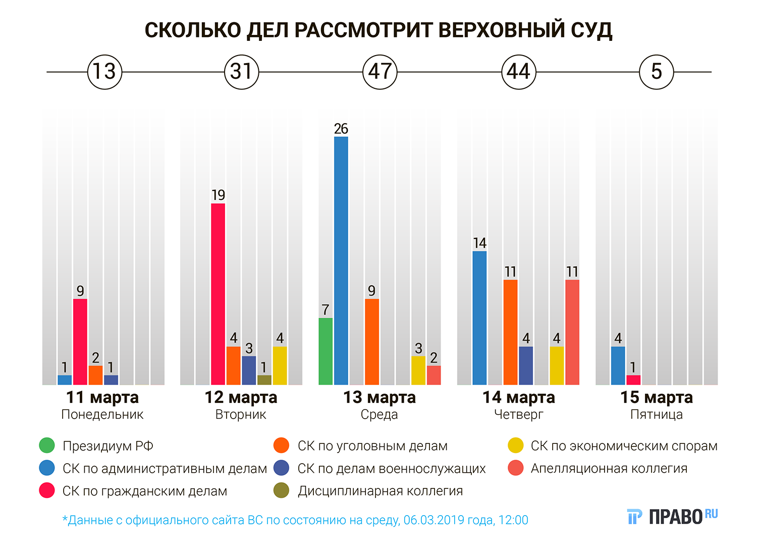 Административная коллегия ВС запланировала рассмотреть 45 споров, в том числе:
