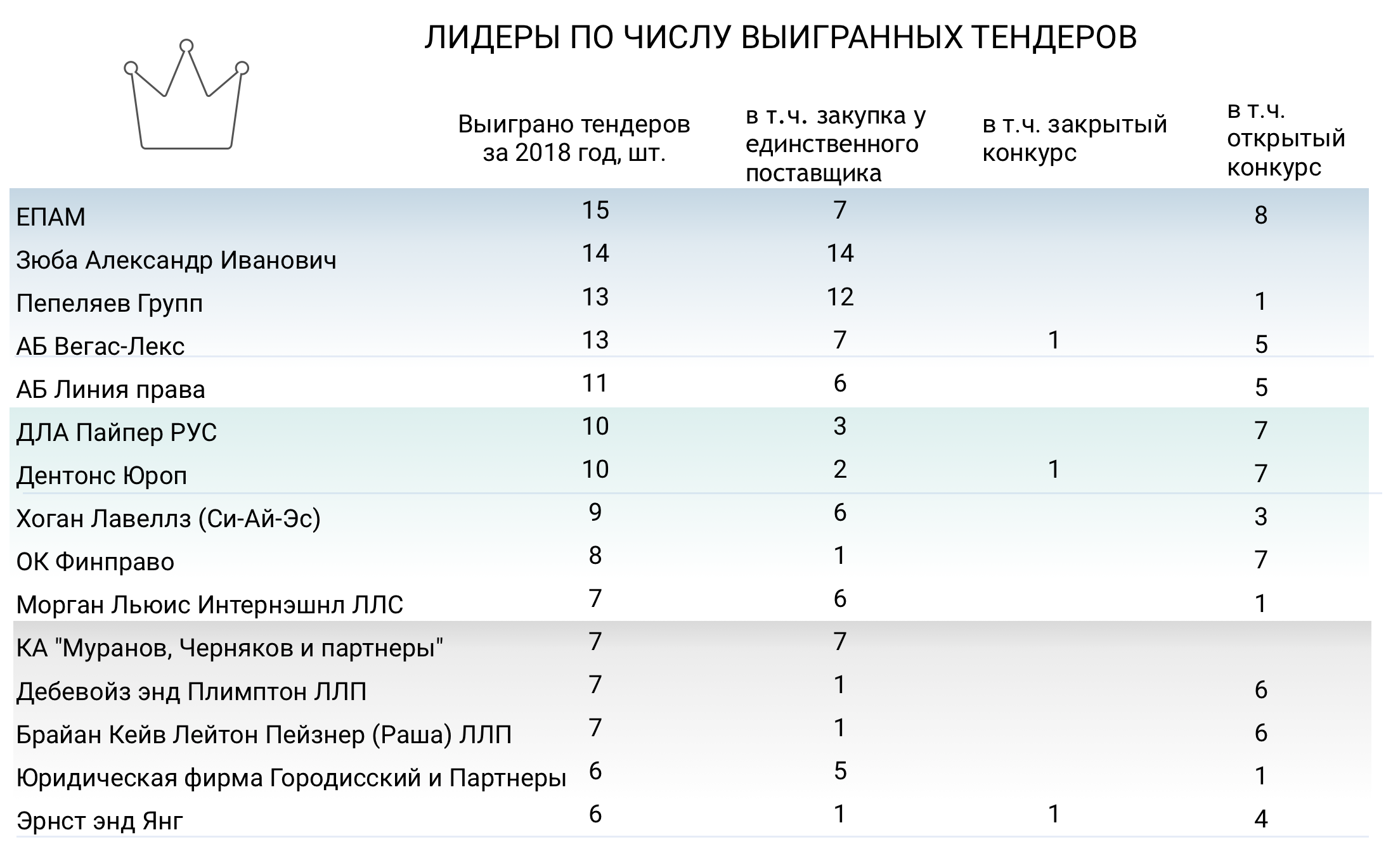 По открытым данным, «Вертикаль» участвовала в 25 тендерах и победила в одном, DLA Piper Rus – в 34, выиграла 10 из них, ГК «КСК» из 13 тендеров выиграла один, также одна победа и 12 участий у «Альтхаус Консалтинга».