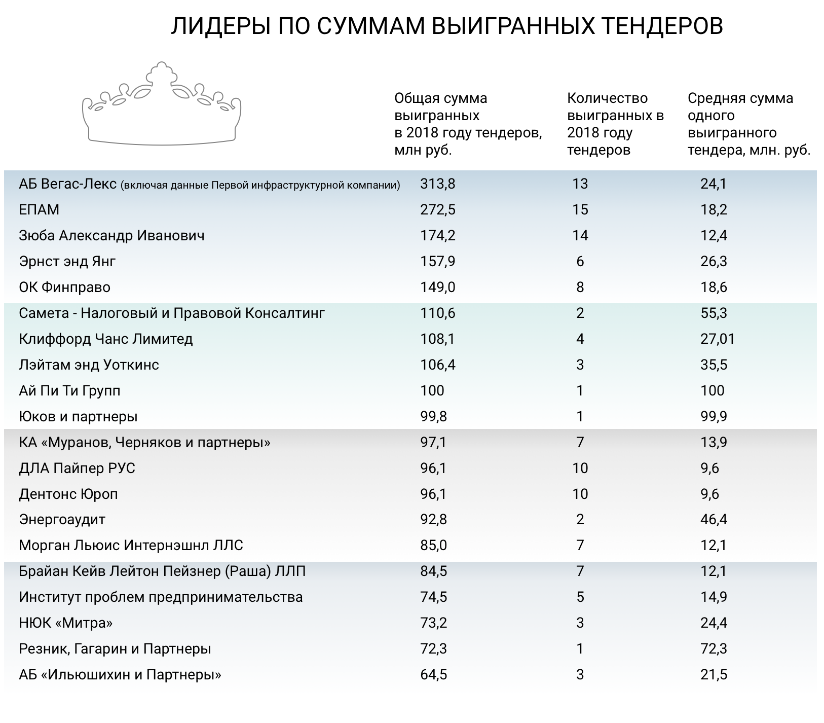Рейтинг рассчитан на основе тендеров, объявленных с 1 января 2018 года по 31 декабря 2018 года. Сведения о торгах получены из Единой информационной системы в сфере закупок. Учтены тендеры, проведенные в соответствии с 223-ФЗ и 44-ФЗ; закупки по Общероссийскому классификатору продукции по видам экономической деятельности обозначены как подкласс «Услуги юридические» (ОКПД 69.1).
