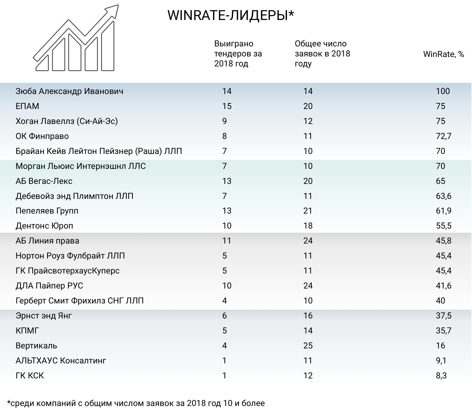 Лидеры по числу тендеров и по их сумме в значительной мере перекликаются с первой 20-кой WinRate лидеров, то есть тех, у кого число участий в тендерах максимально приближается к числу побед в них. 100%-ный результат показал Александр Зюба из «Монастырский, Зюба, Степанов & Партнеры», который выиграл все 14 тендеров, в которых участвовал. Он же стал единственным ИП с высокими показателями в рейтинге. Преимущественно госзаказчики предпочитают работать с компаниями. Заказчиками Зюбы были Приморский торговый порт и Новороссийский морской торговый порт.