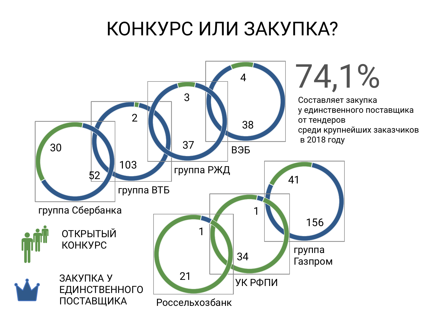 Юридические тендеры у крупнейших заказчиков, как правило, проходят в форме закупки у единственного поставщика (в 74,1% случаев), то есть без конкурса. На основе открытых данных можно сделать вывод, что чаще всего к закупке у единственного поставщика прибегала «Группа ВТБ» (98%) и «Группа РЖД» ( 92,5%), а реже всего УК «РФПИ» (2,8%) и Россельхозбанк (4,5%).