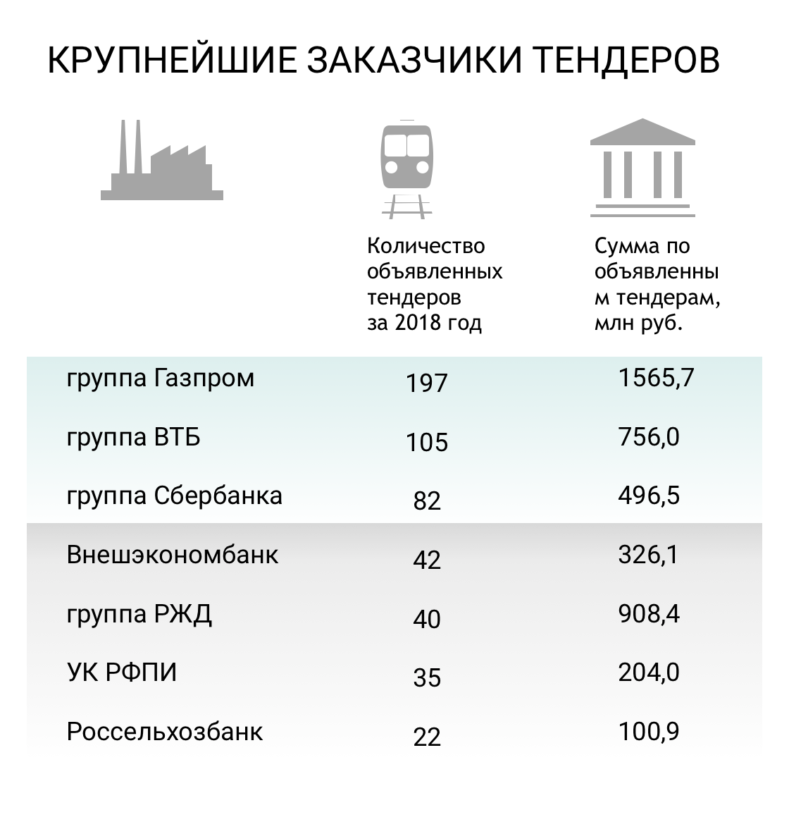 Каждый лот внутри одного тендера посчитан как отдельный тендер. Данные по компаниям, входящим в холдинги, приведены по группе компаний; участие в холдинге считается как доля владения в каждом звене по всей цепочке больше 50%, по данным «Спарк» на 1 января 2019 года. Компании, принадлежащие Минобороны, Росимуществу и т. д. не объединялись.