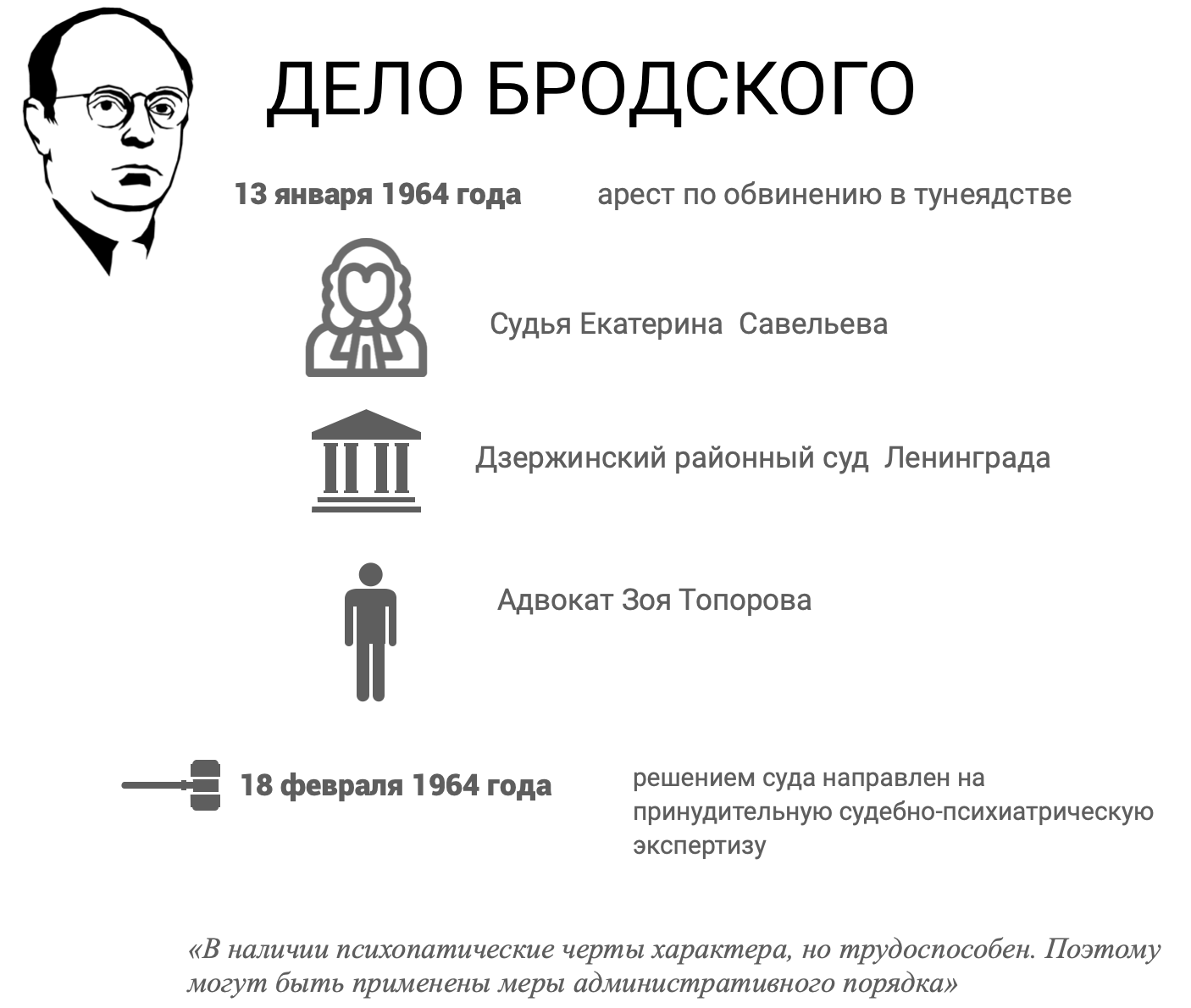 Арестуют Бродского 13 января 1964 года, а чтобы вынести по этому административному делу самый строгий приговор (пять лет ссылки), судье Екатерине Савельевой из Дзержинского районного суда Ленинграда потребуется два заседания. На первом Бродского отправят на принудительную судебно-психиатрическую экспертизу. По ее результатам напишут заключение: «В наличии психопатические черты характера, но трудоспособен. Поэтому могут быть применены меры административного порядка». Сам Бродский рассказывал, что в больнице к нему фактически применяли пытки.