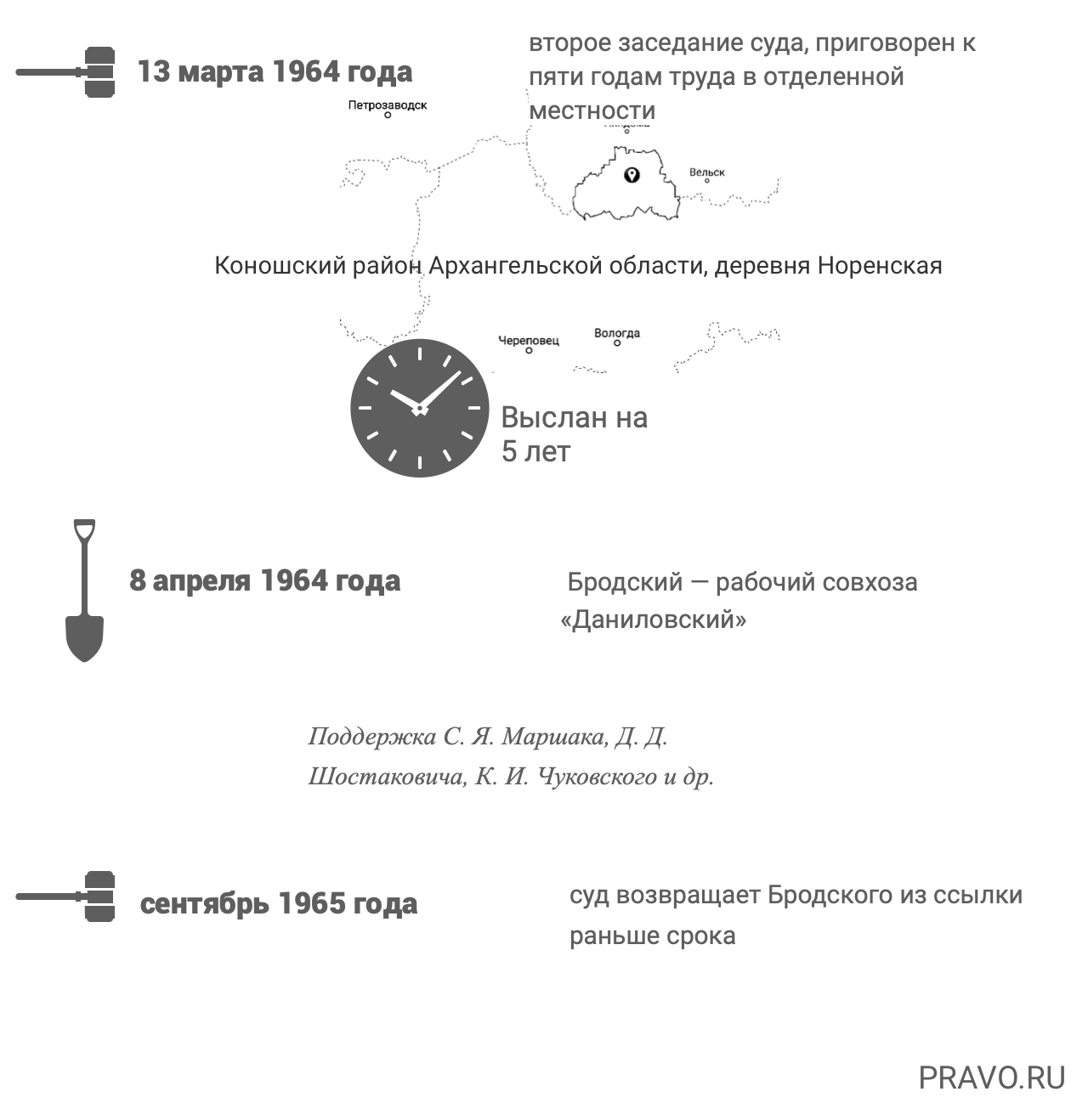 Документов с самого процесса нет, так как это было «обычное» административное дело, но сохранилась известная запись Фриды Вигдоровой (она была журналистом и правозащитником). «Бродский систематически не выполняет обязанностей советского человека по производству материальных ценностей и личной обеспеченности, что видно из частой перемены работы. Предупреждался органами МГВ в 1961 году и в 1962 – милицией. Обещал поступить на постоянную работу, но выводов не сделал, продолжал не работать, писал и читал на вечерах свои упадочнические стихи. Из справки Комиссии по работе с молодыми писателями видно, что Бродский не является поэтом. Его осудили читатели газеты «Вечерний Ленинград». Поэтому суд применяет Указ от 4/П. 1961 года: сослать Бродского в отдаленные местности сроком на пять лет с применением обязательного труда», – записала Вигдорова о приговоре.