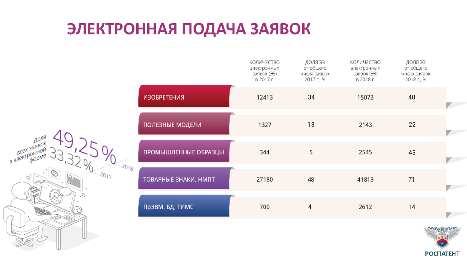 Говорил глава ведомства и о долгоиграющих планах на развитие интеллектуальной собственности в РФ. Ивлиев подчеркнул, что сейчас Россия идет на 8-м месте по количеству заявок о выдаче патентов на изобретение, а к 2024 году должна выйти на 5-е место, обогнав Индию и Германию. К этому же периоду необходимо поднять до 50% количество компаний, которые занимаются технологическими инновациями в стране. По мнению докладчика, уже в следующем году нужно увеличить до 1 млрд руб. объем кредитования малого и среднего бизнеса под залог прав на интеллектуальную собственность.