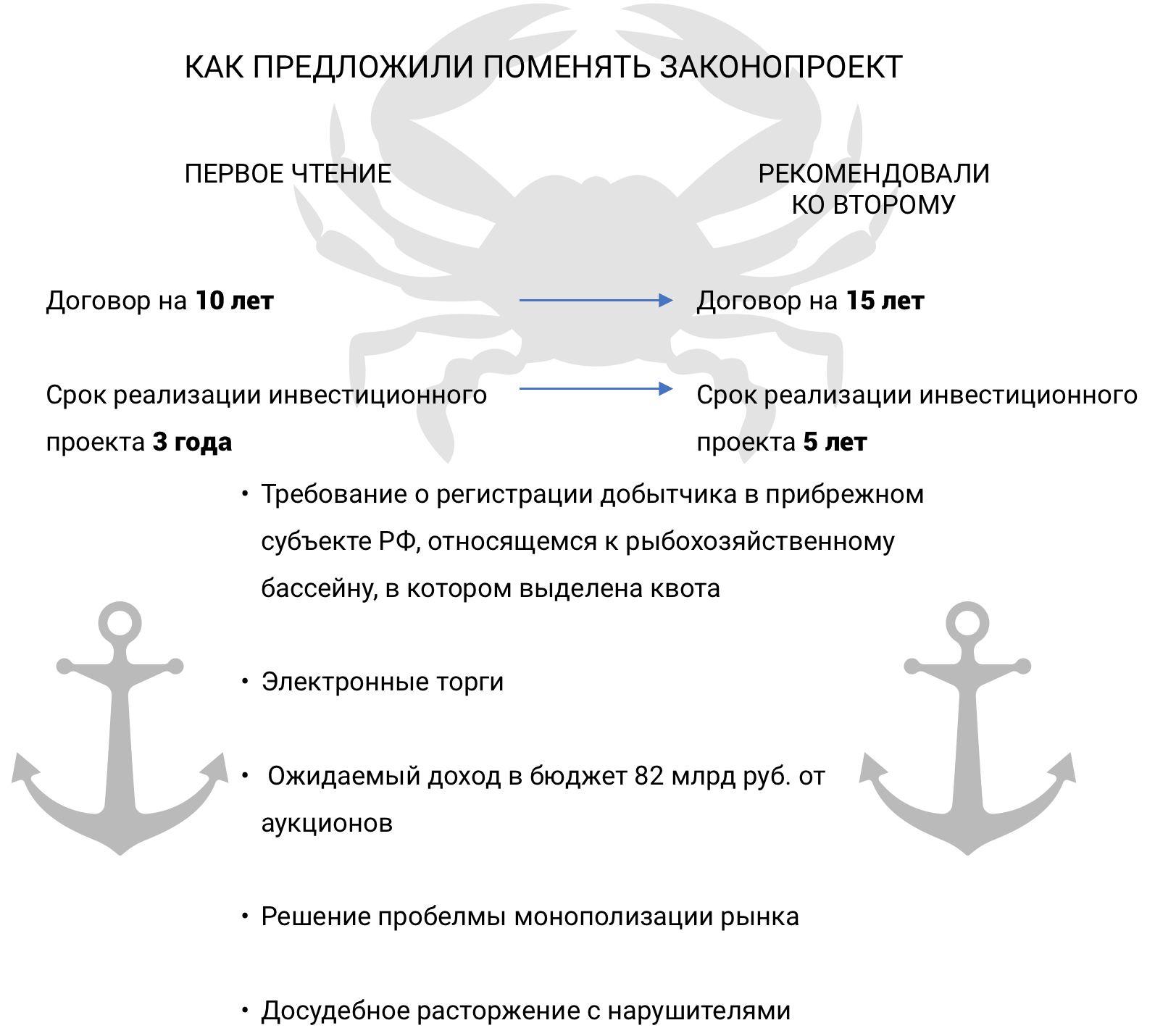В апреле ко второму чтению комитет рекомендовал только несколько поправок: аукционы предложили проводить в форме электронных торгов. Если компания-победитель не реализует обещанный проект, то государство может изъять квоту во внесудебном порядке и вновь выставить на торги. В первой версии проект предполагал, что достаточно будет трехлетнего «бездействия», в поправках комитет согласился увеличить этот срок до пяти лет. Но самая главная поправка увеличивала срок договора по квоте с 10 до 15 лет.