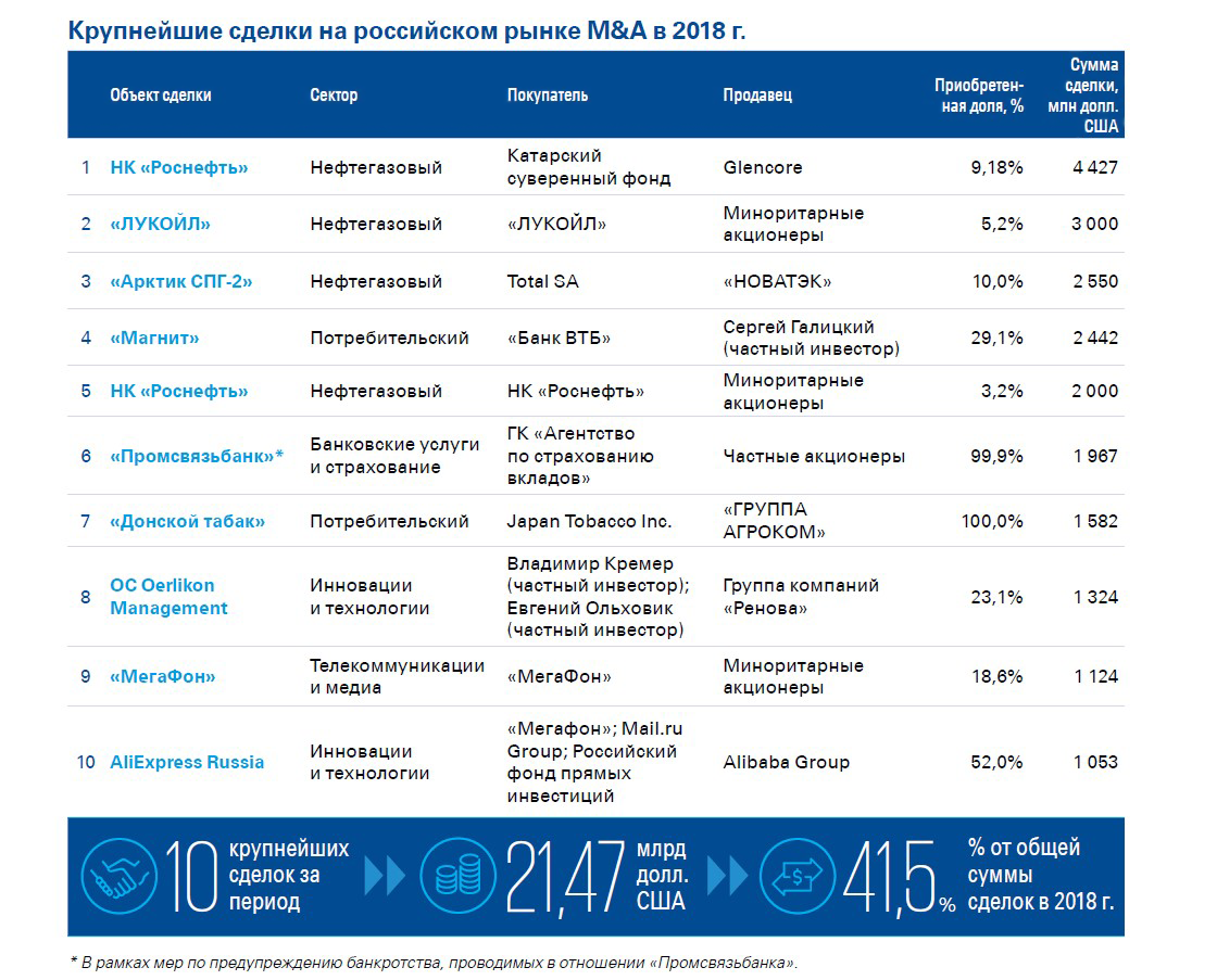 В обзоре к рейтингу Chambers Global 2019 говорится, что российский рынок слияний и поглощений показал рост на 134% по стоимости сделок. Ведущими в этом сегменте стали следующие отрасли: энергетика и природные ресурсы, информационные технологии и розничная торговля. По исследованию КПМГ в 2018 году провели 652 сделки против 552 в 2017. Главной тенденцией, по их мнению, стала консолидация активов. Компании часто прибегали к выкупу собственных акций: значительные пакеты собственных ценных бумаг у миноритариев купили «Роснефть», «Мегафон» и «Лукойл».
