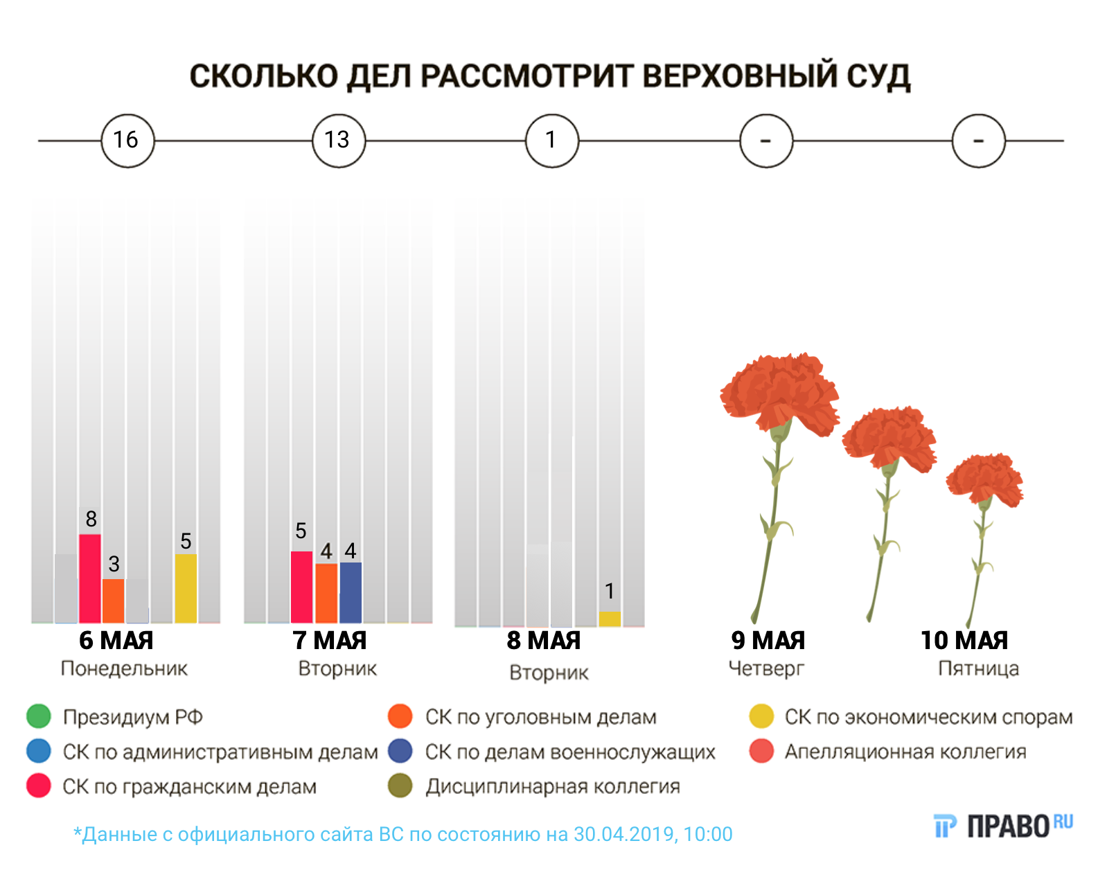 В Президиуме ВС, апелляционной и дисциплинарной коллегиях дел не назначено. Судебная коллегия по гражданским делам рассмотрит 13 споров, среди которых: