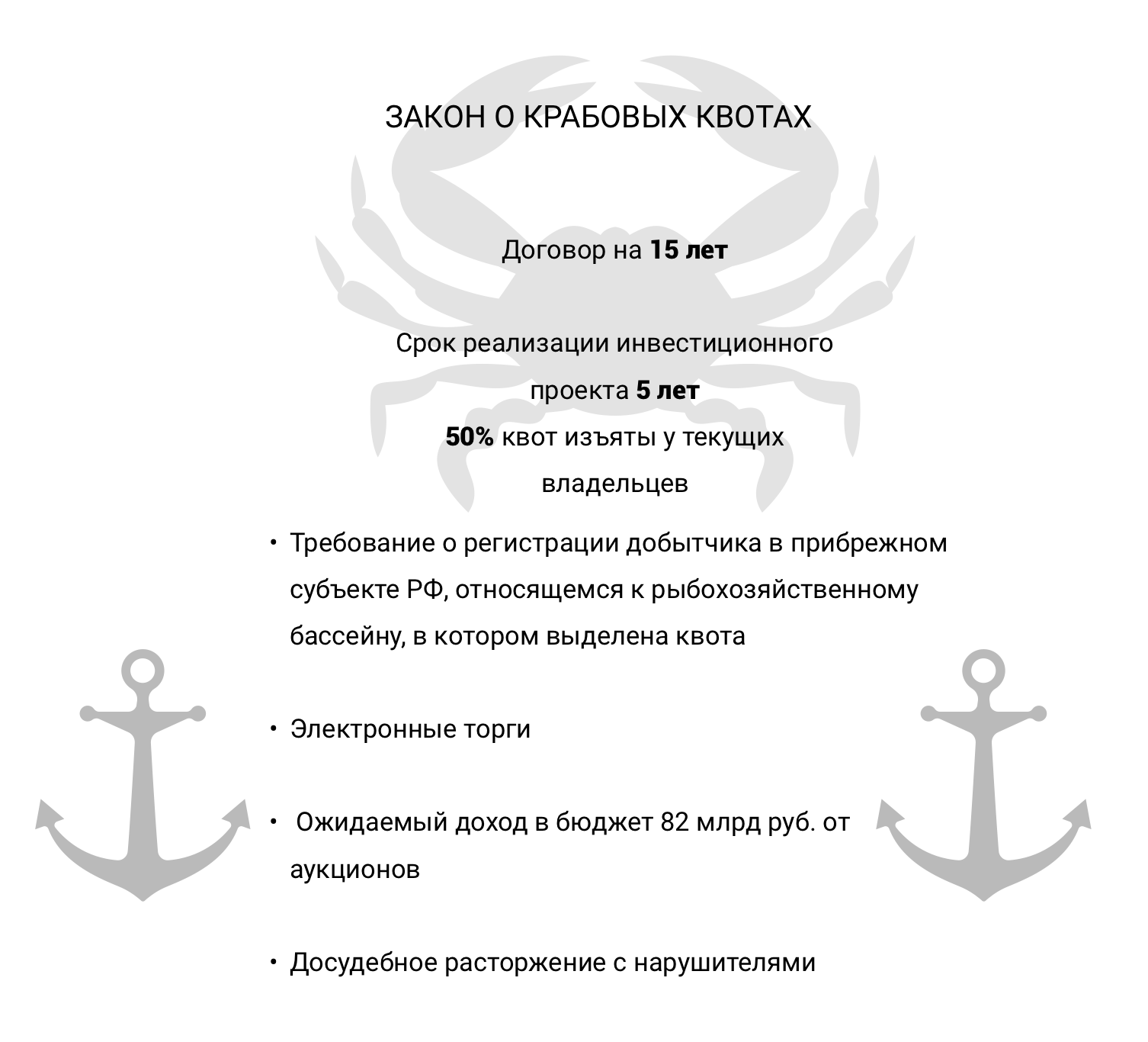 Изменения в ФЗ «О рыболовстве и сохранении водных биологических ресурсов» внесли быстро: буквально за два месяца. Суть проекта в том, чтобы изъять у текущих держателей квот на добычу крабов 50% и выставить на инвестиционные аукционы. После такой манипуляции правительство намерено реализовать две задачи: пустить новых игроков на рынок (то есть предупредить монополизацию), по итогам проведения аукционов принести деньги в бюджет. Планировалось выручить около 82 млрд руб. Однако будут ли достигнуты принятыми поправками поставленные задачи?