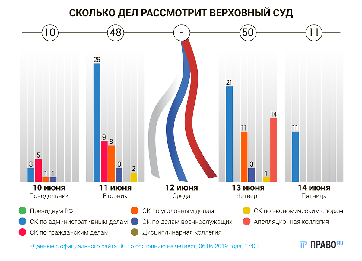 В дисциплинарной коллегии и Президиуме ВС дел не назначено. Апелляционная коллегия рассмотрит 14 дел, а коллегия по делам военнослужащих – семь. Коллегия по уголовным делам изучит 21 жалобу, в том числе такие резонансные: