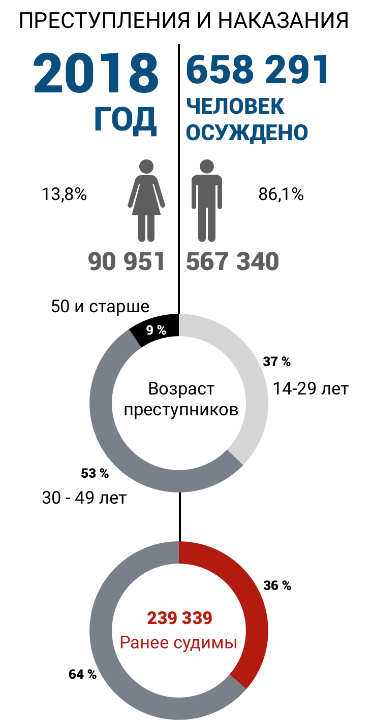 Неизменным остается и портрет преступника – это безработный мужчина 30–49 лет, который в половине случаев совершил преступление нетрезвым и не первый раз. Предприниматели под статьи попадают примерно с той же частотой, что и раньше: в 2018 году приговоры услышали 9235 бизнесменов (9699 – в 2017 году).