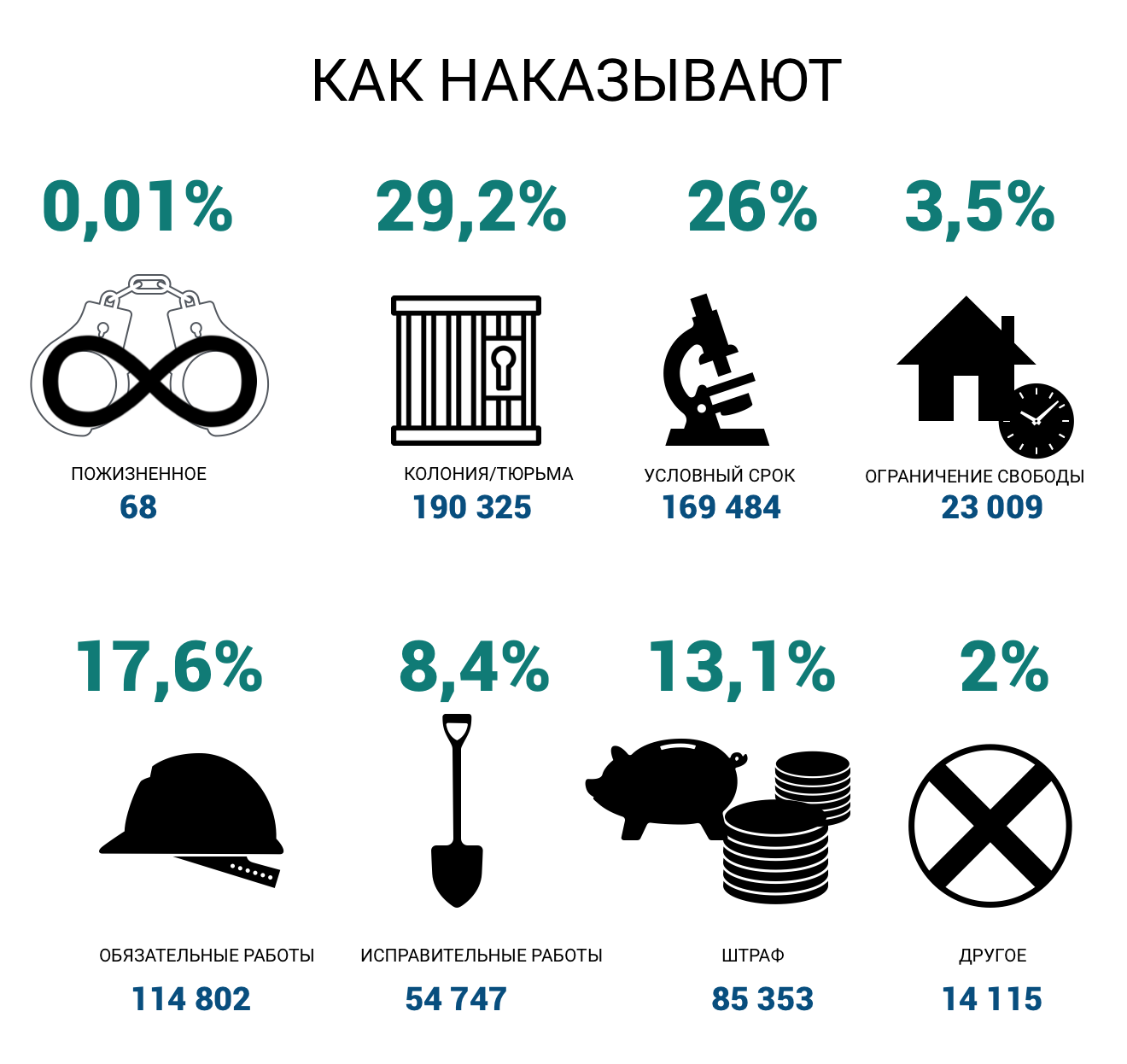 Самыми многочисленными остаются наркотические статьи, они составляют 13,8% от всех преступлений. В 2018 году из 91 073 осужденных реальные сроки получили 37 423 человека.