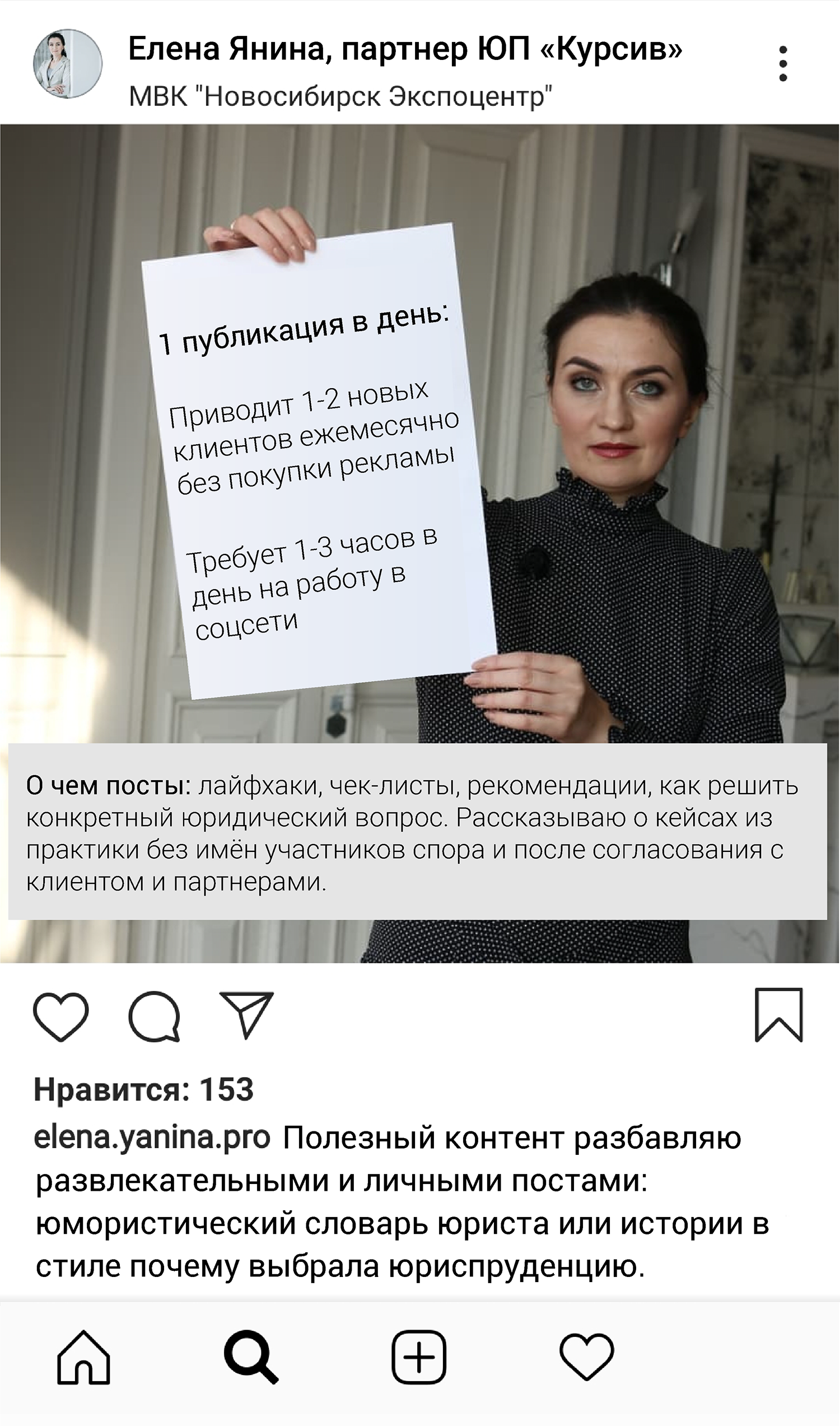 Чтобы избежать подобных ситуаций, лучше всего сосредоточиться на позитивной повестке. Беспроигрышный вариант – выкладывать посты только на профессиональные темы, а для привлечения внимания использовать мультимедийные материалы: фото, видео, инфографику и даже опросы. И пусть такая информация выкладывается на личной страничке юриста, у многих она будет ассоциироваться с компанией, где работает пользователь. Старший менеджер по PR Пепеляев Групп Александра Старостина советует юристам смотреть на свои странички в социальных сетях глазами клиентов: обратитесь ли вы к такому консультанту за юрпомощью или нет.