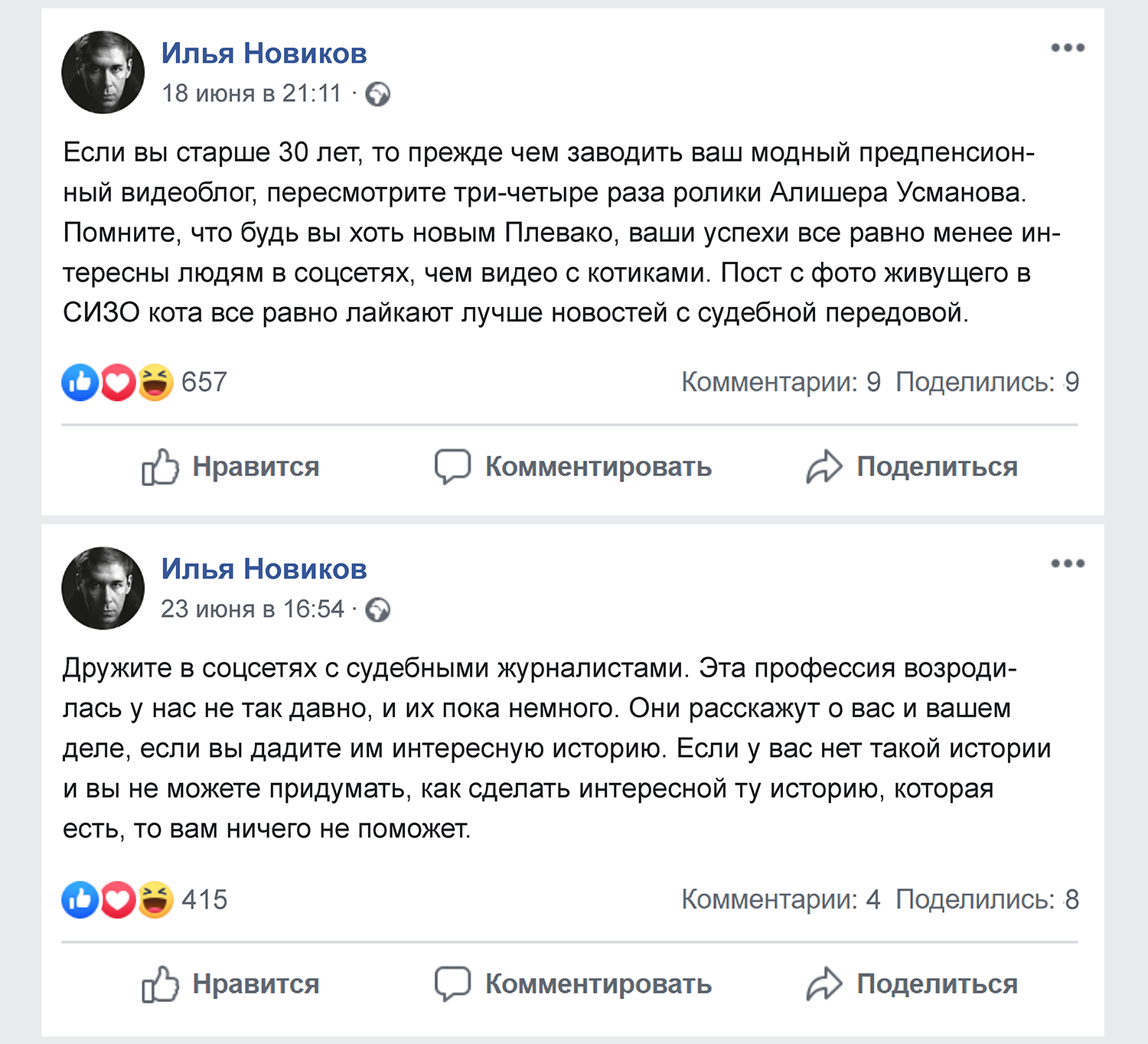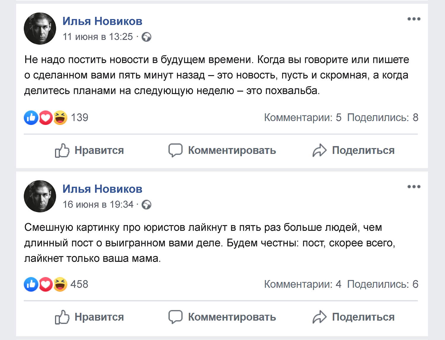Главное – не отпугнуть потенциальных клиентов своей манерой вести соцсети. Явно лишними будут посты в жанре «после продуктивного рабочего дня мы с коллегами любим поиграть в гольф, поесть устриц и выпить коктейль», говорит адвокат Илья Новиков. На его страничку в Facebook подписано более 65 000 пользователей. Сейчас юрист защищает украинских моряков, задержанных по подозрению в незаконном пересечении границы. До этого адвокат добился помилования украинской летчицы Надежды Савченко. По словам Новикова, правозащитный пафос тоже уместен реже, чем кажется: «Формулировки «отстоять права моего доверителя», «возмутительное беззаконие», «мы будем обжаловать вплоть до ЕСПЧ» и т. п. странно смотрятся в рассказе про дело о взыскании алиментов».