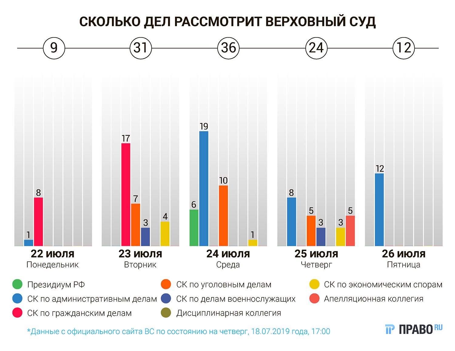 С 22 по 26 июня Верховный суд планирует рассмотреть около 112 дел. В апелляционной коллегии рассмотрят пять дел. В дисциплинарной коллегии дел не назначено. В Президиуме планируют рассмотреть шесть дел, в том числе пять дел, которые поступили из ЕСПЧ. В трех из них обвиняемые проходили по «наркотической» ст. 228.