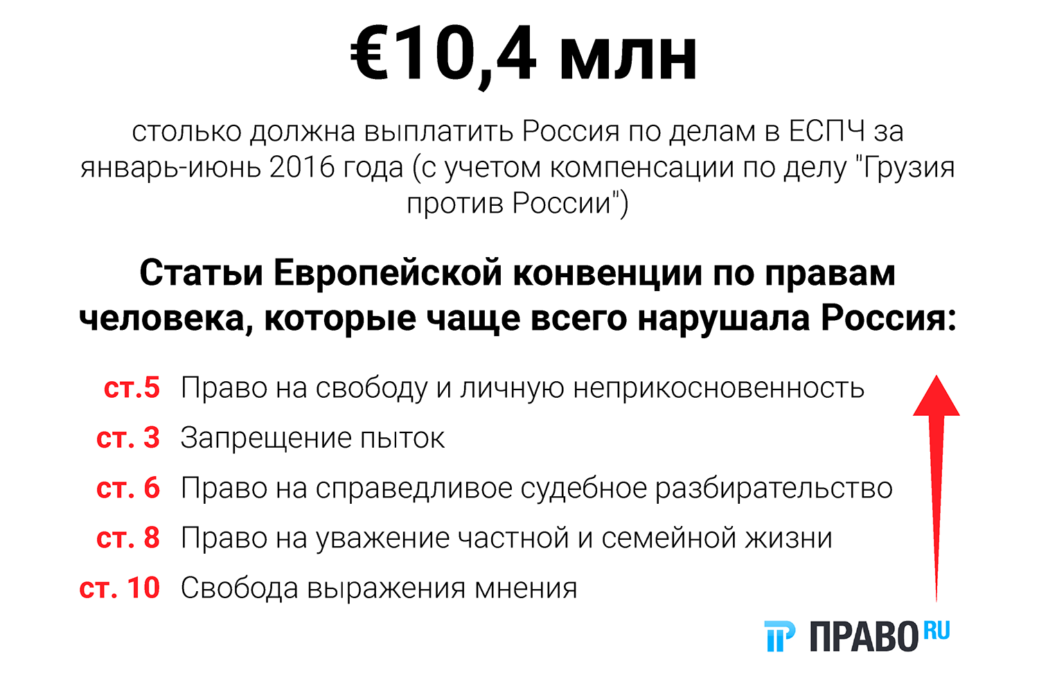 – ЕСПЧ взыскал с России €10 млн по спору с Грузией. Вопрос касался высылки из страны граждан в 2006 году. Согласно решению Страсбурга, за признанные нарушения Европейской конвенции Москва заплатит €10 млн. Это в семь раз меньше, чем требовала изначально грузинская сторона.