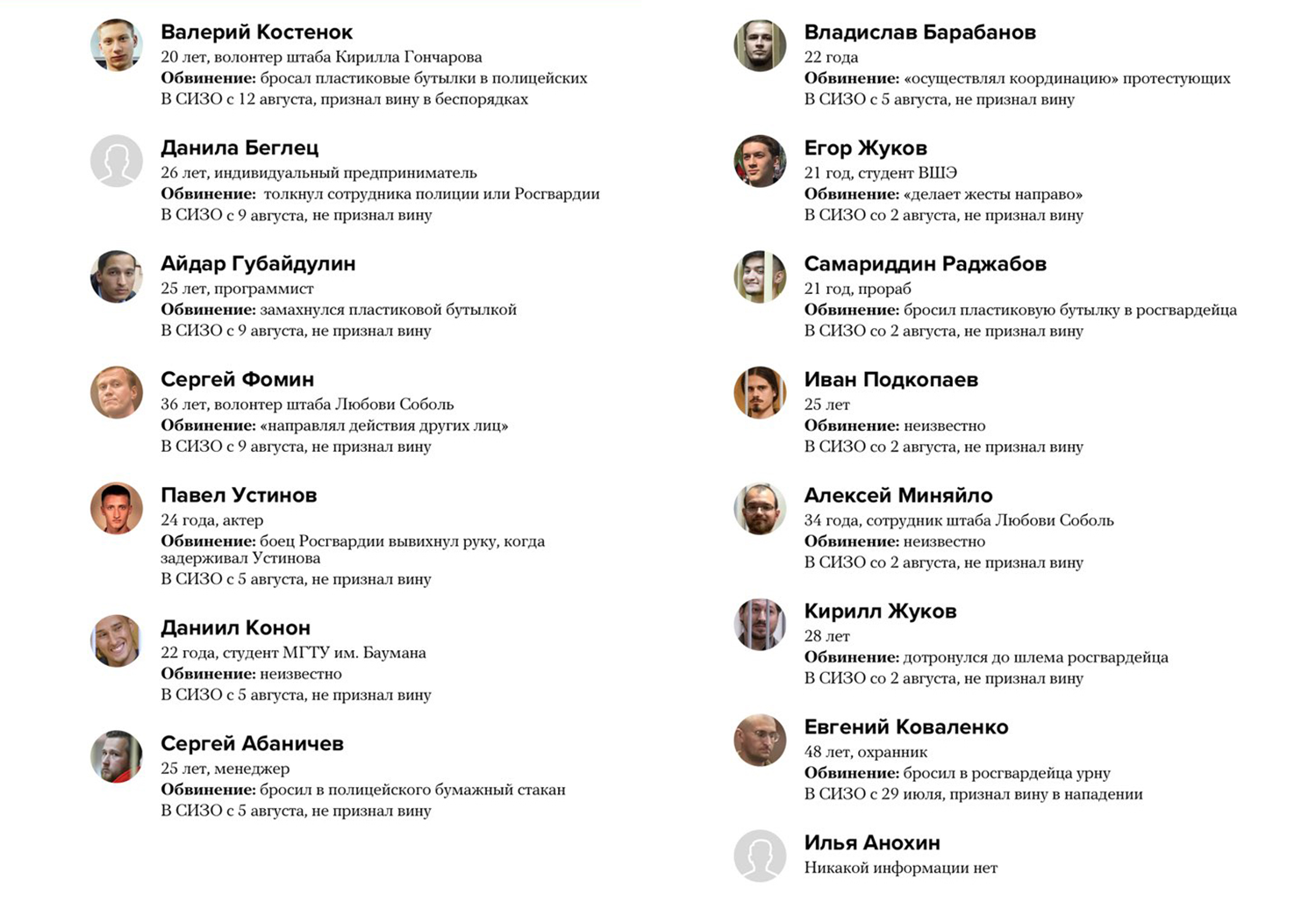 К первым подозреваемым силовики с ночными обысками пришли 31 июля. За 10 дней следствие добилось ареста 14 обвиняемых. 11 из них инкриминируют участие в «массовых беспорядках», еще трое – Кирилл Жуков, Евгений Коваленко и Данила Беглец – проходят по ст. 318 УК («Применение насилия в отношении представителя власти»). Первый якобы задел лицо росгвардейца, когда поднимал забрало его шлема, второй кинул мусорную урну в сторону сотрудников правоохранительных органов. Беглец, по версии следователей, схватил полицейского за руку во время задержания. Следствие хотело арестовать и страдающего сахарным диабетом режиссера Дмитрия Васильева, но он попал в реанимацию после задержания, из-за того что силовики забрали у него инсулин. Васильев больше недели оставался в качестве подозреваемого и без меры пресечения, а 19 августа его статус изменили на «свидетеля».