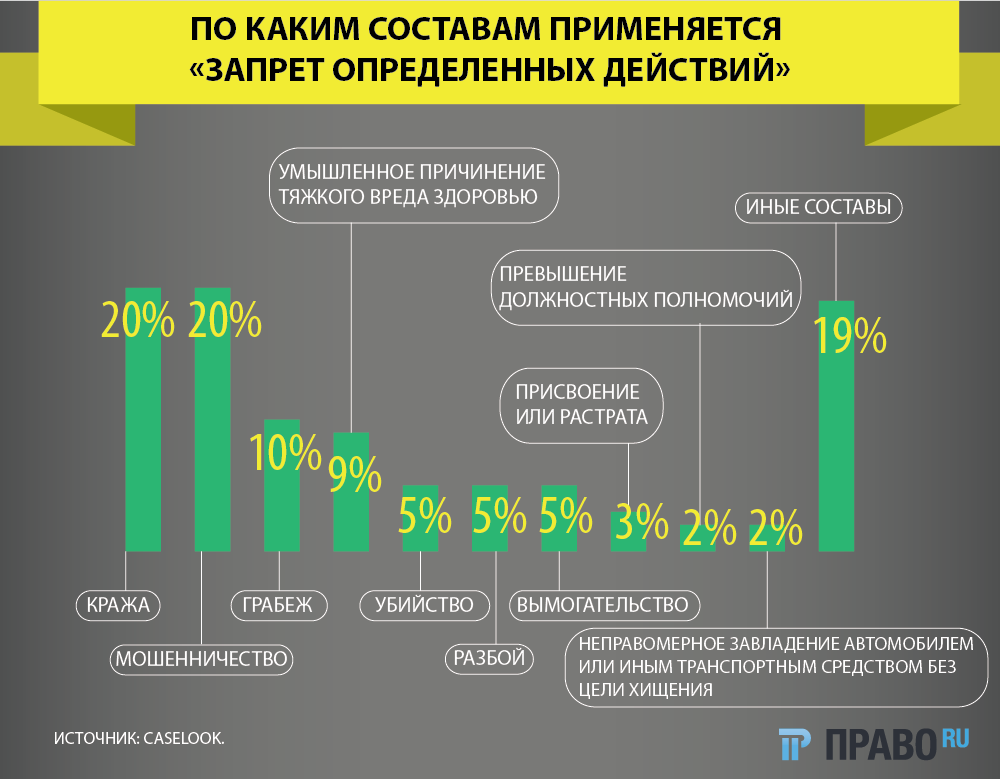 Чтобы запретить какие-то действия, судье необходимо как можно детальнее погрузиться в обстоятельства конкретного дела. И в этом случае не получится ограничиться общими фразами и ссылками на то, что обвиняемый может угрожать неопределённым абстрактным лицам, отмечает Чекотков. Зато такая мера будет способствовать эффективному расследованию, уверен эксперт. По данным Caselook, её применяют в основном к фигурантам дел о краже или мошенничестве.