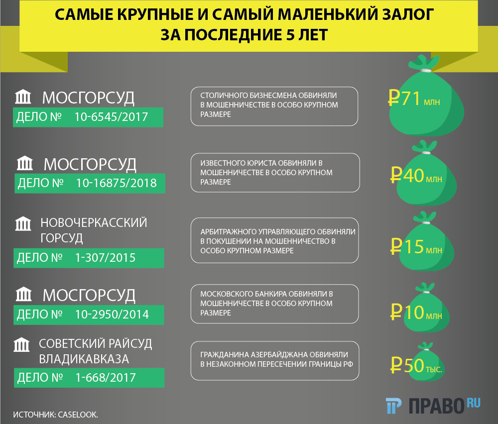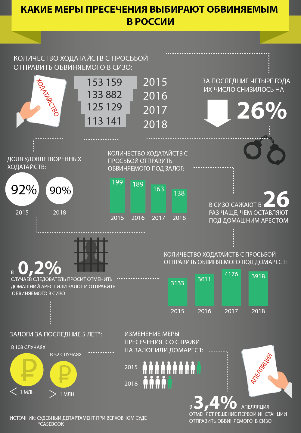 В России существует восемь видов мер пресечения: от подписки о невыезде до заключения под стражу. Чем менее тяжкое преступление инкриминируется обвиняемому, тем больше у него шансов получить меру, которая не будет связана с лишением свободы, говорит Дмитрий Солдаткин, управляющий партнёр МКА Солдаткин, Зеленая и партнеры. Закон предусматривает, что если наказание по вменяемому составу не превышает трёх лет лишения свободы, то под стражу фигуранта такого дела стоит отправлять только в исключительных случаях. Тем не менее следователи стараются заключить обвиняемых именно в СИЗО. На начало текущего года там находилось 99 722 человека. Из них 9625 – в столичных изоляторах. Это почти на 11% выше установленной нормы. Лимит численности заключённых, которые находятся в московских СИЗО, превышен седьмой год подряд.