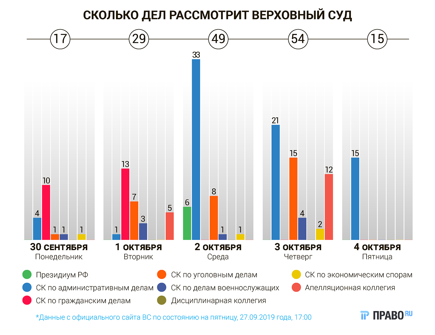 С 30 сентября по 4 октября в Верховном суде рассмотрят 164 дела. В их числе – спор о гонораре успеха в коллегии по гражданским спорам, в Президиуме дело бывшего вице-спикера Гордумы, обвиняемого в мошенничестве, а также вопрос о том, спасет ли президента компании от субсидиарной ответственности должностная инструкция.