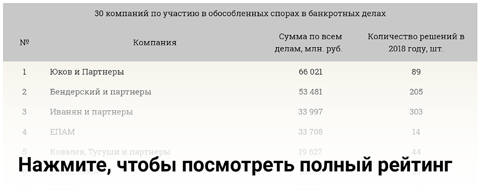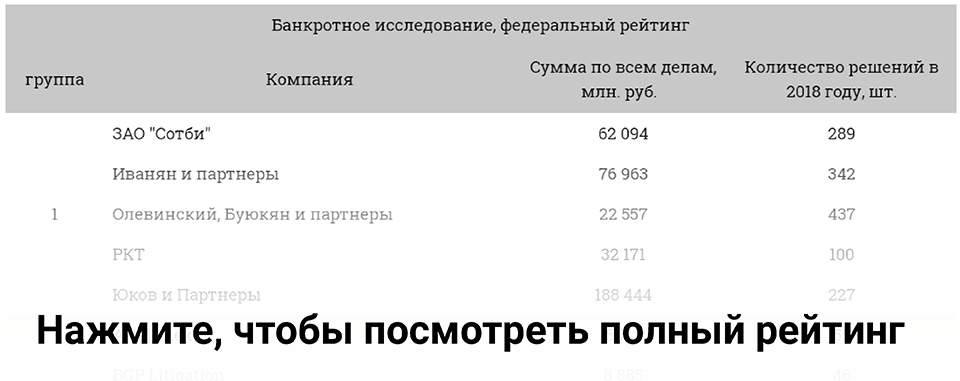 Проанализировав число решений по банкротным делам у юридических компаний, суммы споров, число завершённых дел и другие показатели, «Право.ru» составило рейтинг компаний, наиболее активно и успешно участвующих в банкротных спорах. Лидеры были разделены на четыре группы.