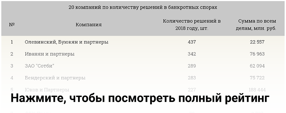 В двадцатке число решений у компаний, лидирующих по этому показателю, колеблется от 27 (у компаний в конце списка лидеров) до 437 (у фирмы-лидера по числу решений по банкротным делам в 2018 году – компании Олевинский, Буюкян и партнеры). Число дел у участников первой пятёрки – от 227 до 437.