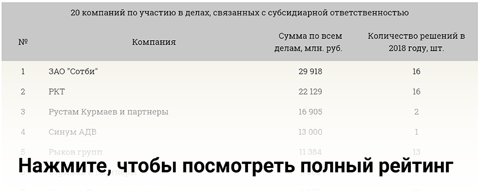 Мы составили топ-20 компаний по участию в делах, связанных с субсидиарной ответственностью, которых становится всё больше в рамках каждого банкротства. Выделены лидеры по сумме по всем делам, параллельно указано число решений о субсидиарной ответственности в 2018 году.