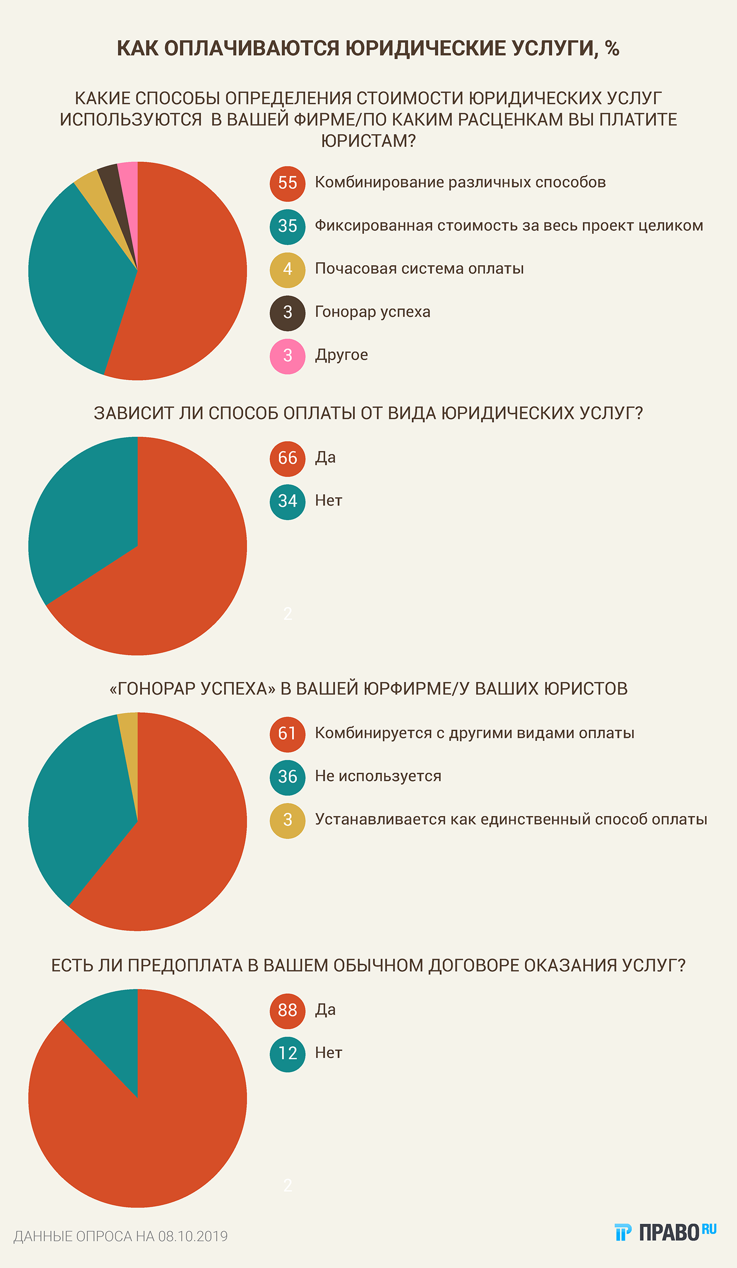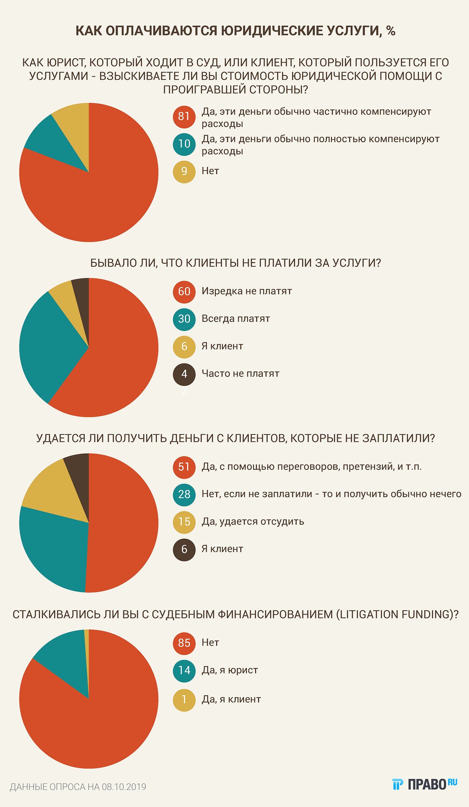 В России именно так привыкли рассчитываться за правовую помощь. Об этом свидетельствуют результаты опроса «Право.ru», в котором участвовали и юристы, и их клиенты. Гонорар успеха в чистом виде используют редко, зато охотно комбинируют этот вид оплаты вместе с другими. Кроме того, опрошенные признались, что если клиент вовремя не перечислил деньги своему юристу, то в дальнейшем добиться возврата долга бывает непросто.
