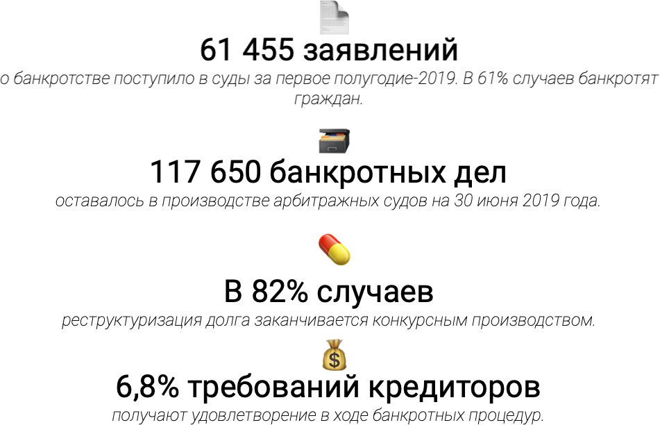 На 30 июня 2019 года в производстве арбитражных судов первой инстанции оставалось почти полмиллиона споров (463 255). Каждое пятое из неоконченных производств – банкротное.