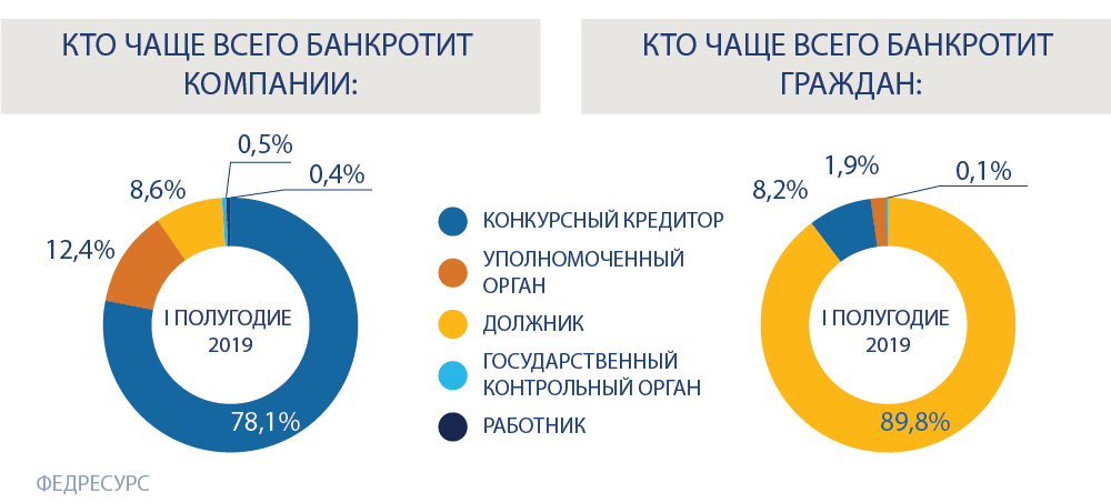 С каждым годом банкротные процедуры становятся всё сложнее, а их продолжительность увеличивается. Из-за этого активно поучаствовать в такой категории дел могут только финансово устойчивые организации, замечает Сергей Хухорев, юрист Инфралекс . По статистике «Федресурса», компании чаще всего банкротят конкурсные кредиторы. Ими являются заимодавцы и контрагенты, которым фирмы задолжали деньги. Число таких заявителей в банкротных делах велико из-за высокой закредитованности бизнеса, объясняет партнёр ART DE LEX Ольга Савина. По её словам, среди конкурсных кредиторов большую долю занимают банки: «Являясь залоговыми кредиторами, они не ведут переговоры, а предпочитают банкротить контрагентов. Так как понимают, что получат 70% удовлетворения своих требований из залога».