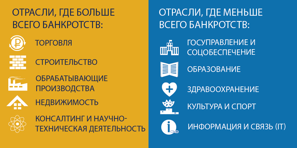 Согласно статистике, чаще всего банкротятся торговые или строительные фирмы. Это напрямую зависит от экономической ситуации в стране, отмечает Савина: «Денег у населения с каждым годом всё меньше, а кредиты становятся всё доступнее и изощрённее». Кроме того, торговый сектор является одной из наиболее активных отраслей экономики, говорит Хухорев: «На рынке, где больше сделок и контрагентов, повышенный риск дефолта по обязательствам, следовательно, выше вероятность возбуждения банкротных процедур против оступившихся контрагентов».