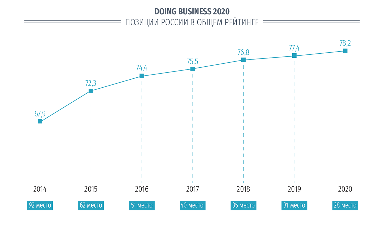 Рейтинг Doing Business составляют экономисты Всемирного банка. Оценка лёгкости ведения бизнеса проводится по 10 показателям, в числе которых – соблюдение условий контракта, лёгкость начала бизнеса и регистрации собственности, банкротство, уплата налогов и другие. При анализе данных по России учитываются только Москва и Санкт-Петербург. Цель войти в двадцатку лидеров была поставлена в указах Владимира Путина, выпущенных после президентских выборов 2012 года. Тогда Россия занимала 120-е место. В этом году России удалось войти в топ-30 рейтинга и занять 28-ю строчку, расположившись сразу после Австрии.