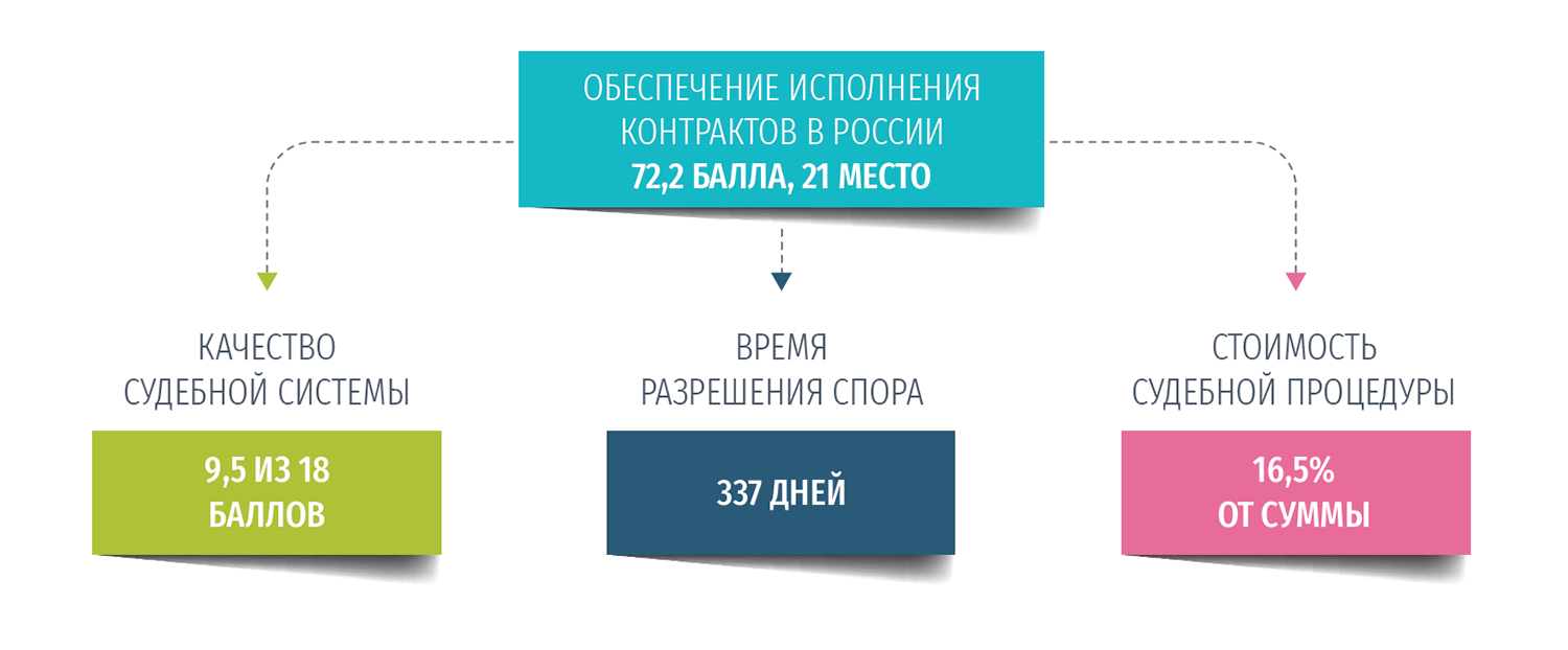 Показатель складывается из оценок «качества судебной системы» (для России 9,5 балла из 18 в DB-2020), «времени разрешения спора» (337 дней для модельного спора) и «стоимости судебной процедуры» (16,5% от суммы).