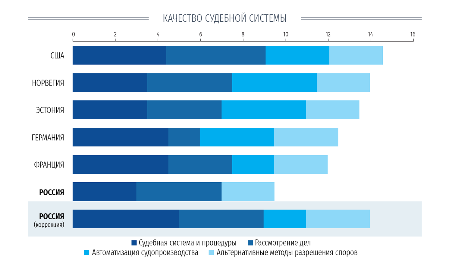 По подсчётам Всемирного банка, качество российской судебной системы – 9,5 из 18 баллов. В действительности же, считают в ЦРСП, адекватная оценка – 14 баллов из 18, что соответствует 11 месту, как в Дании и Норвегии.