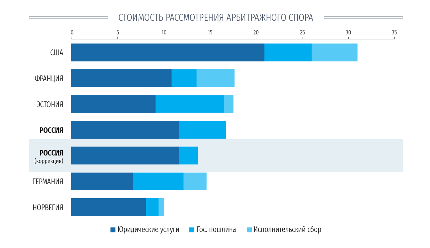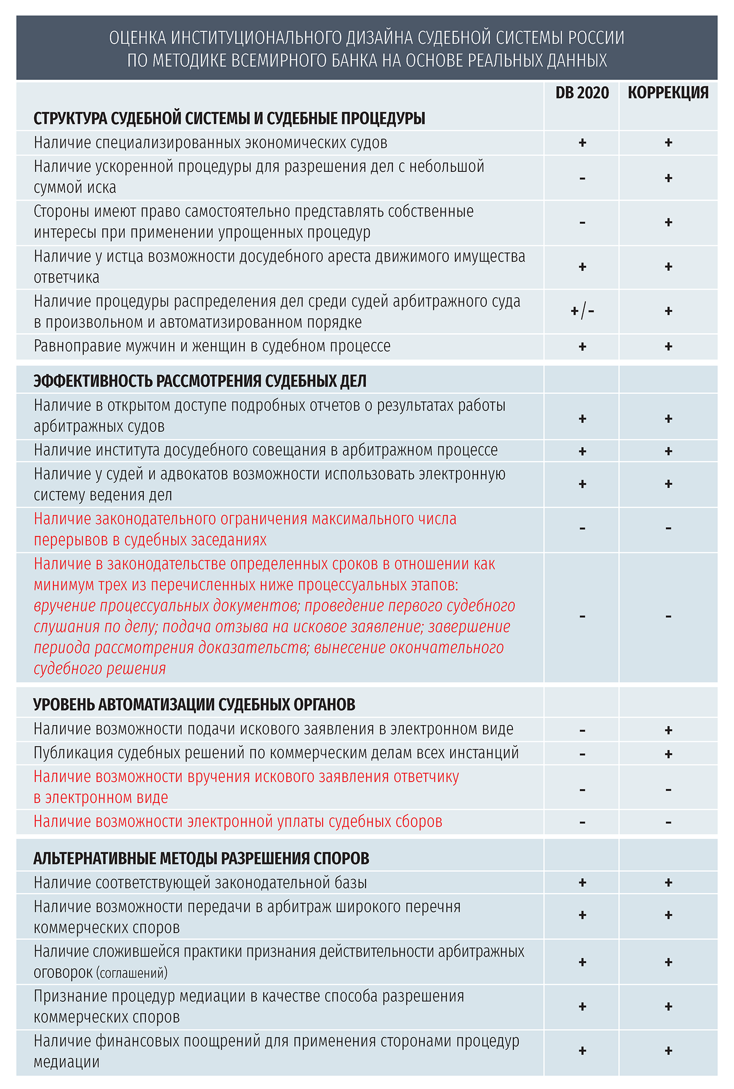 Несмотря на то что в целом оценка высокая, корректный анализ целого ряда показателей, касающихся системы арбитражного правосудия, мог бы сделать реальный балл, полученный Россией, ещё выше, уверены эксперты. Вместо 28-го места она оказалась бы на 26 строчке.