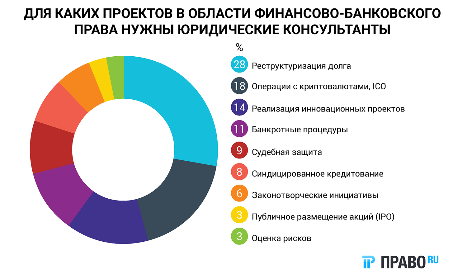 Для начала определимся, для чего вообще ищут «финансовых» юристов. Примерно в четверти всех случаев они нужны компаниям, чтобы справиться с реструктуризацией долгов: 28% опрошенных ответили именно так. Ещё один популярный повод привлечь юристов – это всевозможные операции с криптовалютами и Initial Coin Offering (ICO) (18% голосов).