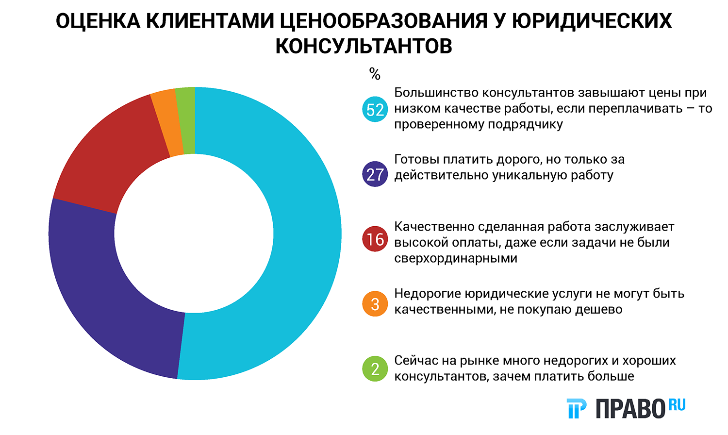 Большая часть опрошенных специалистов (52%) согласились с утверждением, что сейчас на рынке многие консультанты необоснованно завышают цену и не предоставляют при этом пропорционально высокого качества услуг. При этом этот показатель не говорит о «жадности» клиентов, ведь они готовы платить дорого, но только за действительно уникальную работу (27%). Ещё 16% опрошенных считают, что хорошо сделанная работа должна хорошо оплачиваться, даже если поставленные перед юристами задачи не были экстраординарными.