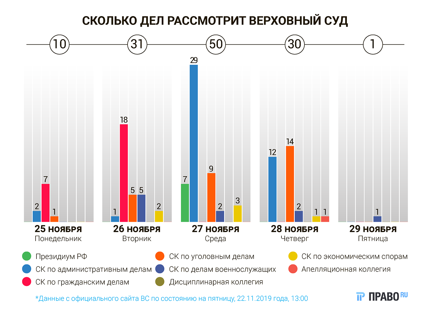 В последнюю неделю осени Верховный суд рассмотрит 132 дела. Президиум ВС рассмотрит несколько вернувшихся из ЕСПЧ дел, в которых Страсбургский суд признал факты полицейского насилия. Гражданская коллегия разберётся, нужно ли отбирать пенсию у того, кому она уже была заплачена, и посчитает, сколько стоит жизнь убитого в полицейском участке сына. В уголовной коллегии – дело рыболовов, которые разоблачили на своём судне сотрудника ФСБ и получили за это три года колонии. А в экономколлегии запланирован интересный спор в деле на 151 млрд: судьям предстоит разобраться, мог ли суд кассационной инстанции направить дело на пересмотр.