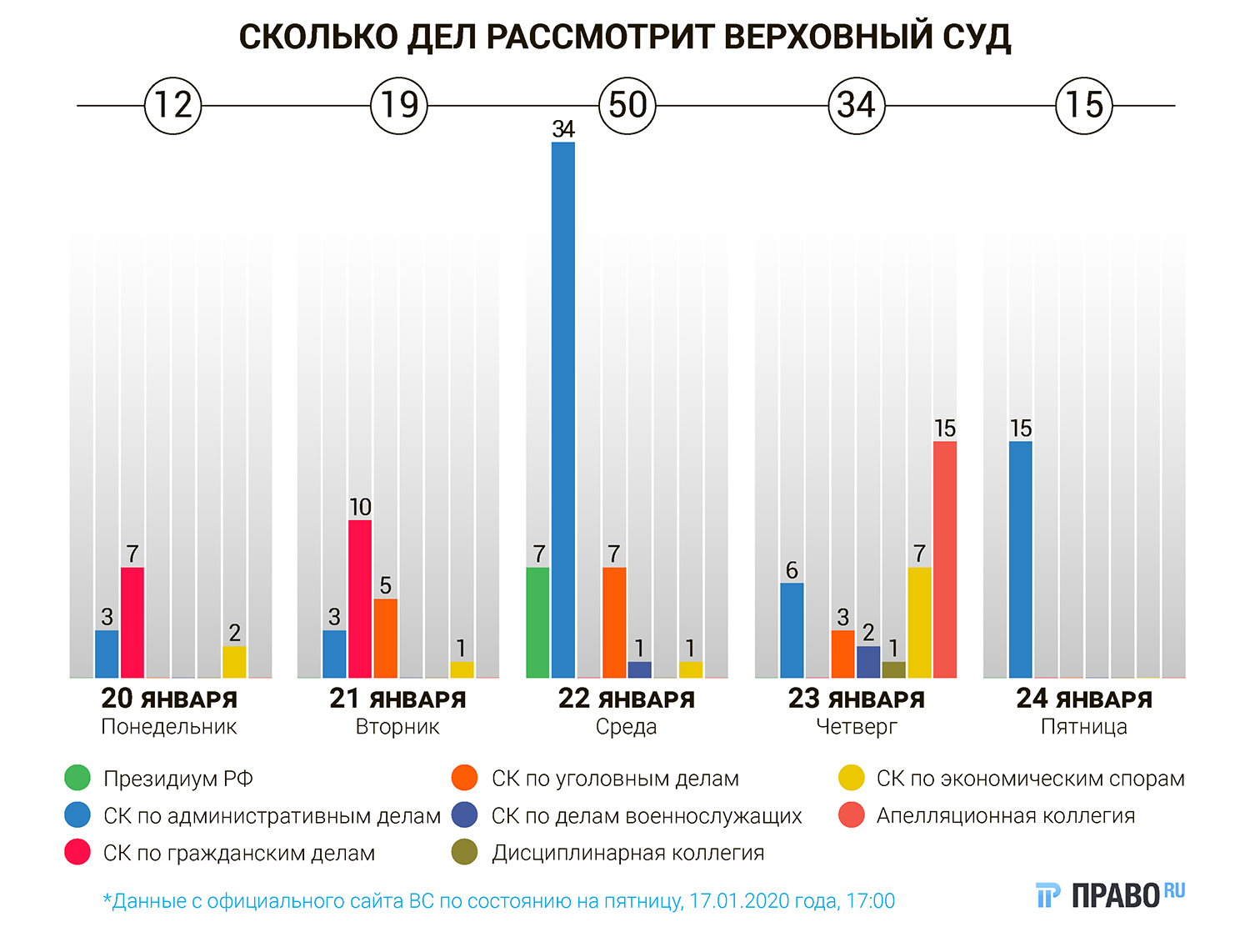 С 20 по 24 января Верховный суд рассмотрит 130 дел. Так, экономколлегия выяснит, когда возможен поворот судебного решения и нужен ли он вообще, а также рассмотрит дело о внебанкротной субсидиарной ответственности директора и участника общества, которые своим бездействием довели фирму до ликвидации. Административная коллегия рассмотрит иск, поводом для которого стала блокировка скандального текста о героине, а апелляционная коллегия будет разбираться с жалобой бывшего судьи, которого осудили в Краснодаре, но оправдали в Страсбурге.