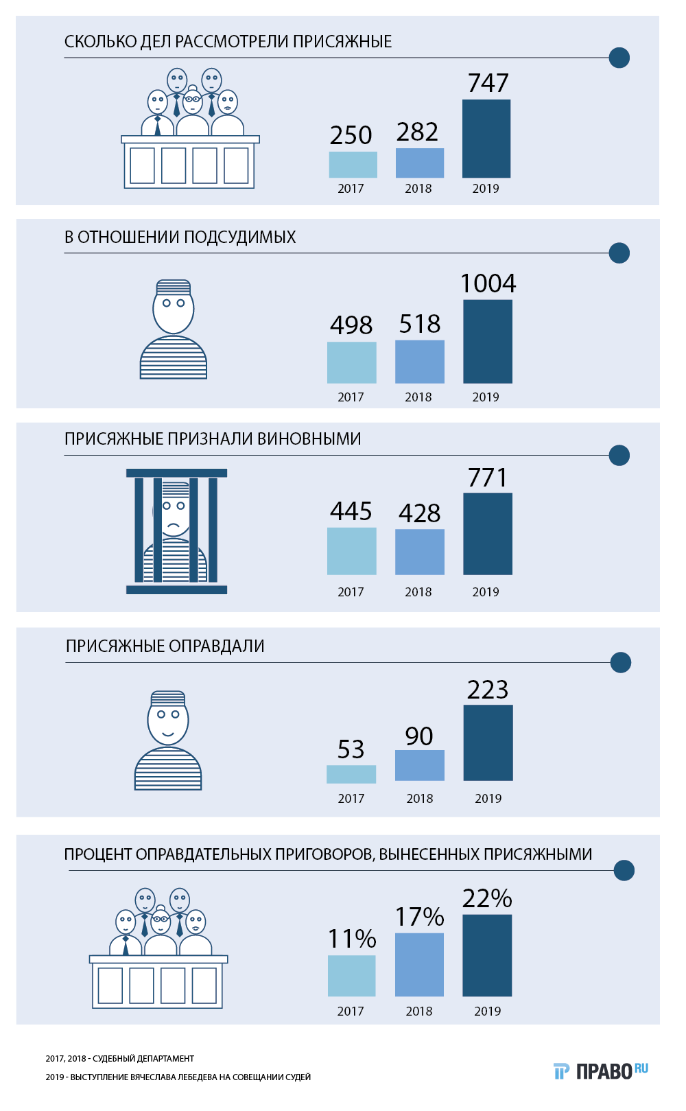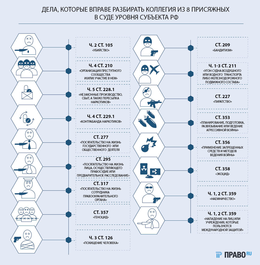 В начале этого года Владимир Путин поручил Верховному суду до 1 июня 2020-го «рассмотреть вопросы о расширении составов преступлений, дела о которых смогут рассмотреть суды с участием присяжных заседателей». А уже в феврале глава ВС Вячеслав Лебедев, выступая на совещании судей судов общей юрисдикции и арбитражных судов, предложил распространить компетенцию суда присяжных на все особо тяжкие составы и дела о преступлениях в сфере предпринимательства.